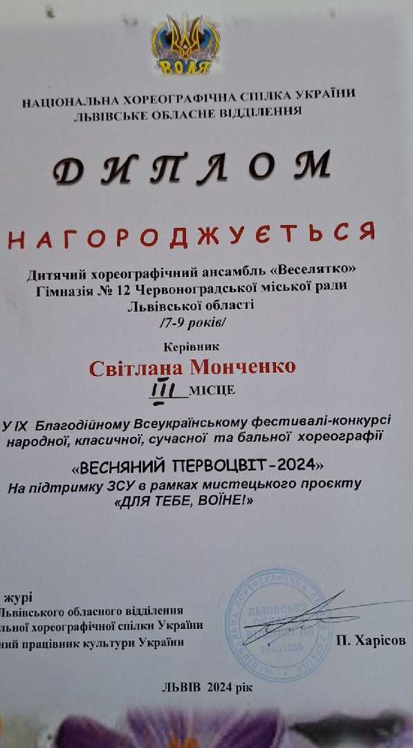 Щиро вітаємо хореграфічний ансамбль "Веселятко" та їхнього керівника Монченко С.С. із ІІІ місцем у ІХ Благодійному Всеукраїнському фестивалі-конкурсі "Весняний первоцвіт-2024", що відбувся в рамках мистецького проєкту " Для тебе, Воїне!".