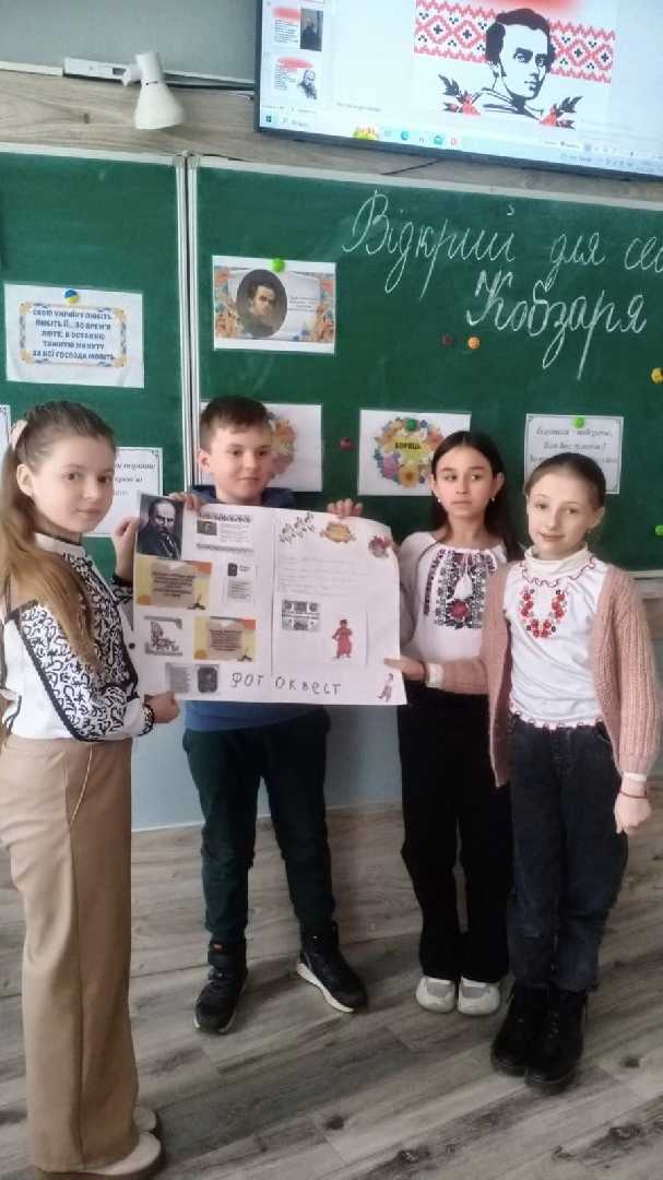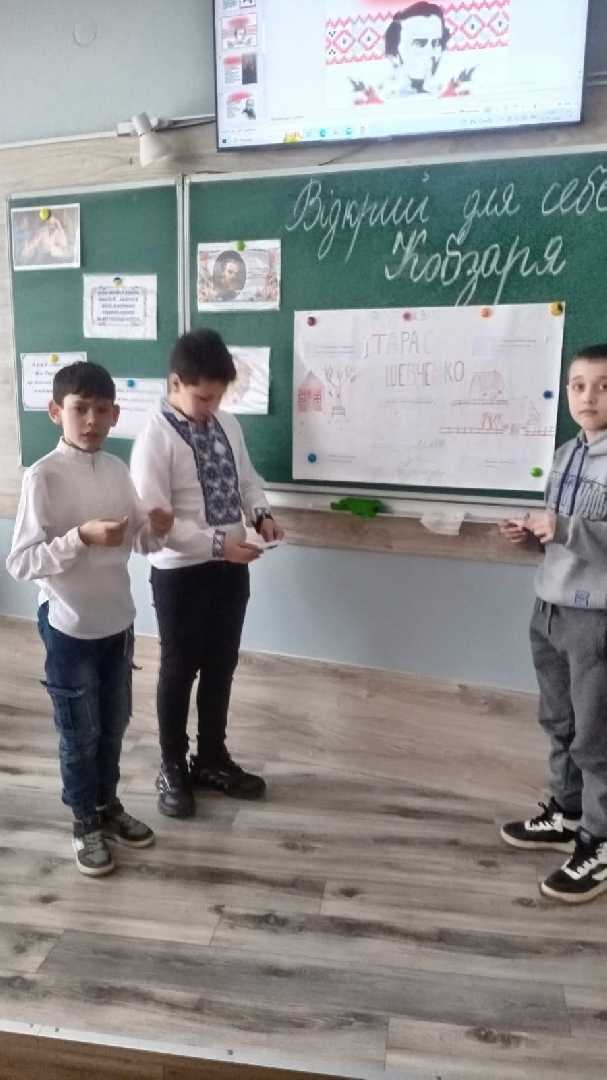 Саме тому з нагоди 210- річчя від дня народження поета учні 5-А класу на уроці української літератури з учителем Малицькою О. В. вшановували пам'ять і відкривали для себе Великого Кобзаря. Учні підготували змістовні презентації цікавих фактів із життя поета, робили чудові фотоквести, також насолоджувалися духовною величчю та красою Шевченкового слова, яке передає безмежну любов до прекрасного українського краю. Діти уміло провели паралелі між сучасними подіями в Україні та поезіями митця. Пам'ятаймо: слово Шевченка сьогодні захищає, надає сили і надихає українців. І на оновленій землі Врага не буде, супостата, А буде син, і буде мати, І будуть люди на землі. Слава героям України!