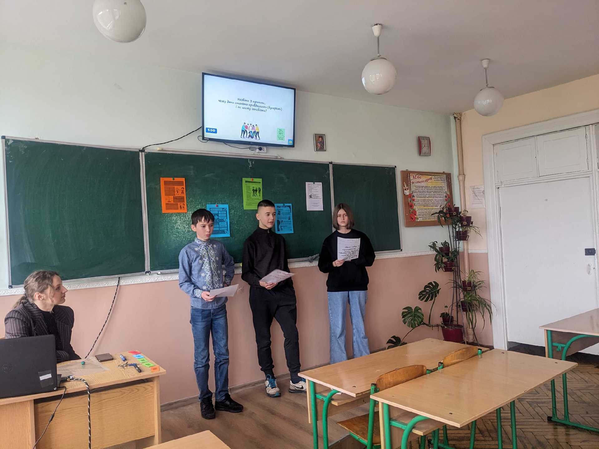 Для учнів 7-А класу психологічною службою школи була проведена вікторина "Булити чи не булити? Ось у чому питання". Під час заняття учні працювали в командах; ознайомлювались з поняттям, нормами та структурою булінгу; розвивали вміння пошуку шляхів виходу із складної ситуації; формували навики відповідальної та безпечної поведінки.