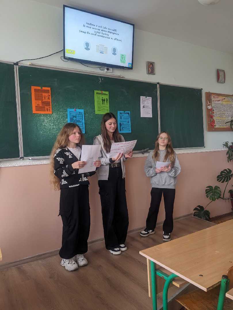 Психологічною службою, для підвищення рівня знань щодо проблем, повʼязаних з насильством з учнями 8-Г класу була проведена карткова ігрова методика «Коло безпеки» на тему «Загальні поняття про насильство». Учні розглянули основні форми та особливості насильства та жорстокого поводження з дітьми, а також запобігання йому.
