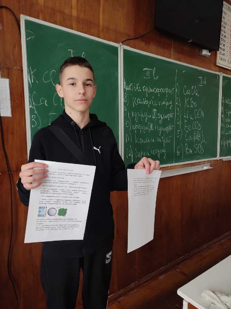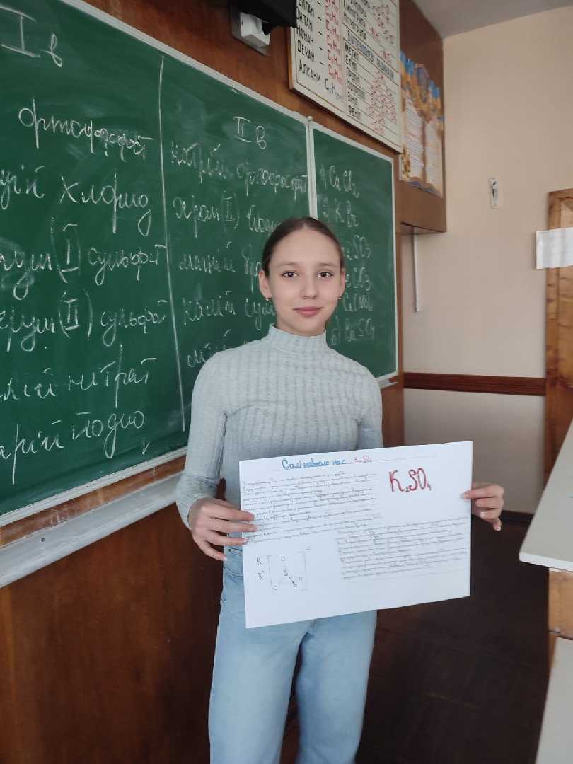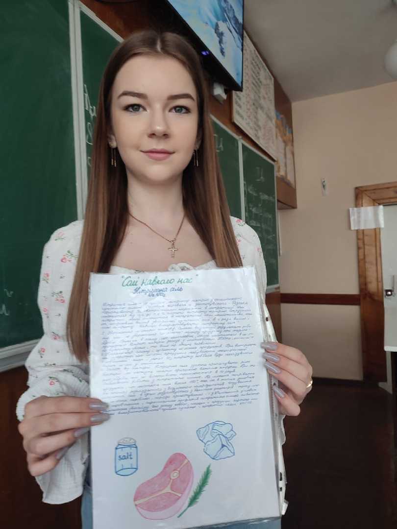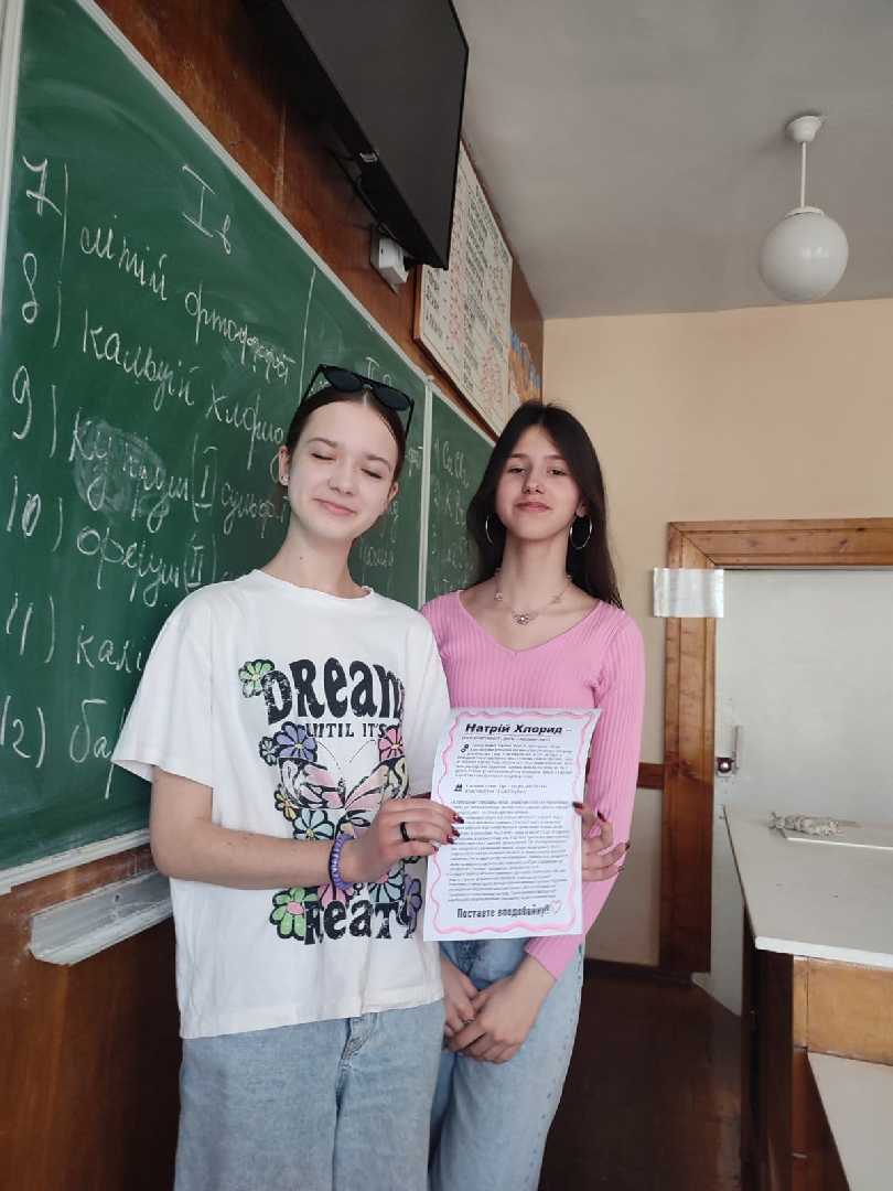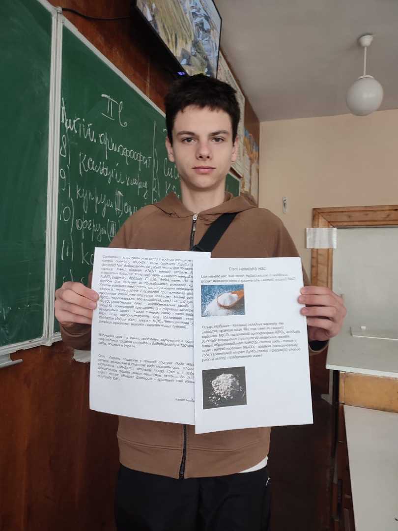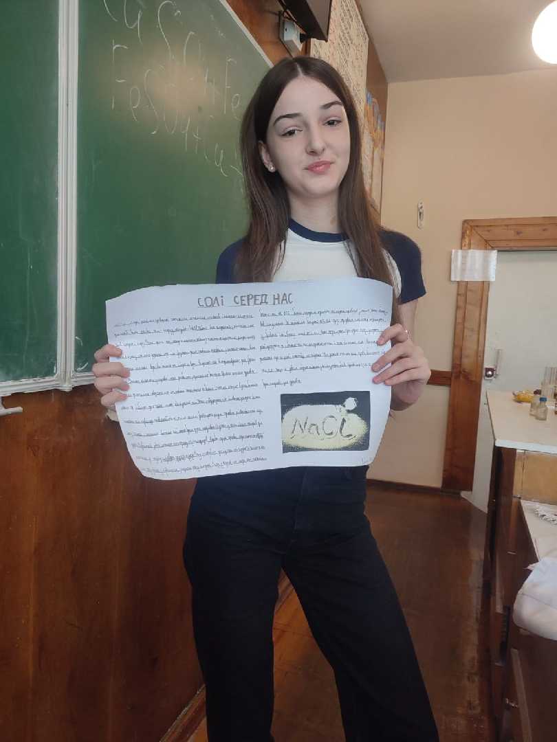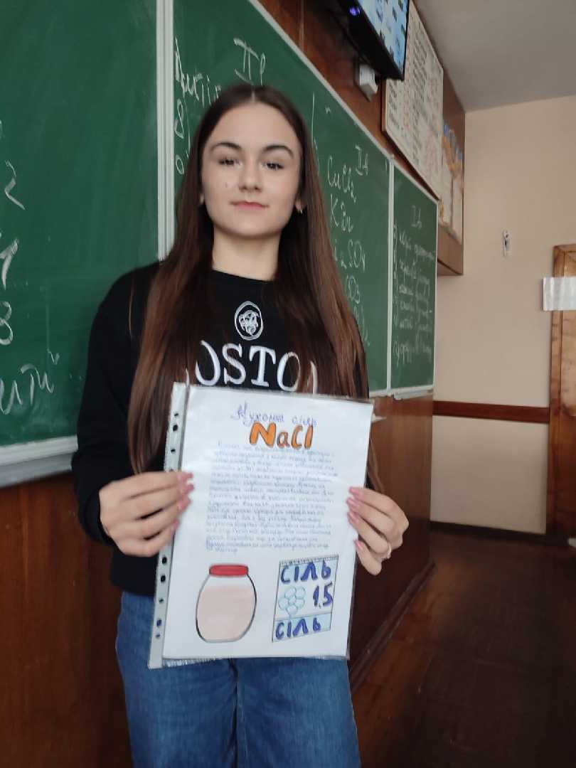 Учні 8-А та 8-Д класів (учитель хімії Мацях Н.Р.) підготували проєкти на тему: "Солі навколо нас". Восьмикласники довідалися про важливість вживання солі, про її денну норму, а також запам'ятали, що надлишок солі, як і недостача, приносить шкоду здоров'ю.