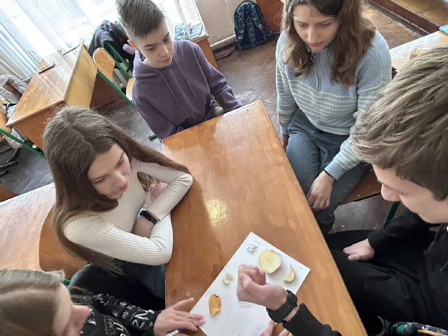 Учитель хімії Мацях Н.Р.провела для учнів 9-Б класу пізнавальний урок. Об'єднавшись у групи, учні провели якісну реакцію на виявлення крохмалю у продуктах харчування. Школярі розвивали критичне мислення, розмірковуючи де більше крохмалю: у суші чи у варениках? Довідалися, що навіть у сметані він є, а там його не мало б бути. Зрозуміли те, що продукти, які містять крохмаль, теж спричиняють підвищення цукру у крові. Адже при гідролізі крохмалю кінцевим продуктом є глюкоза. Зрозуміли, що люди хворі на цукровий діабет, та й здорові теж повинні збалансовано харчуватися.