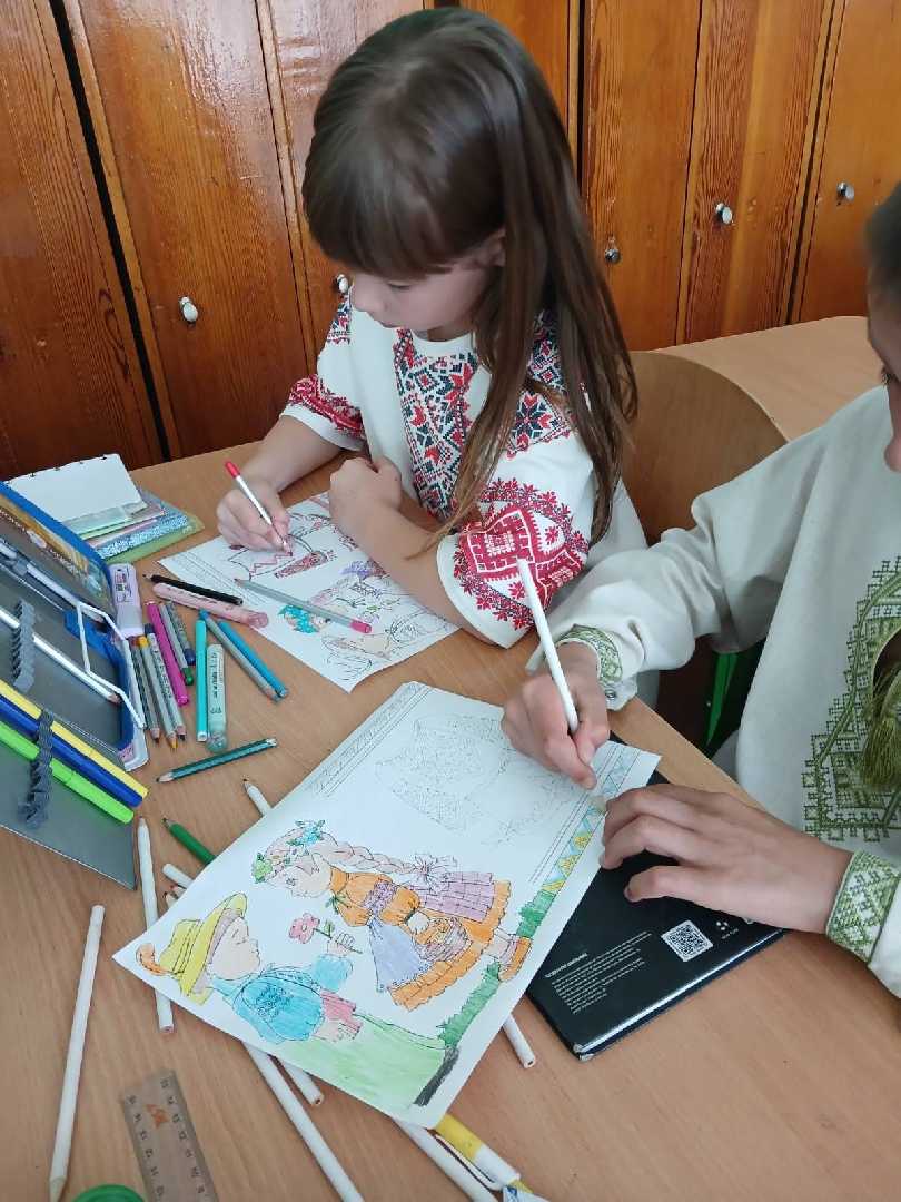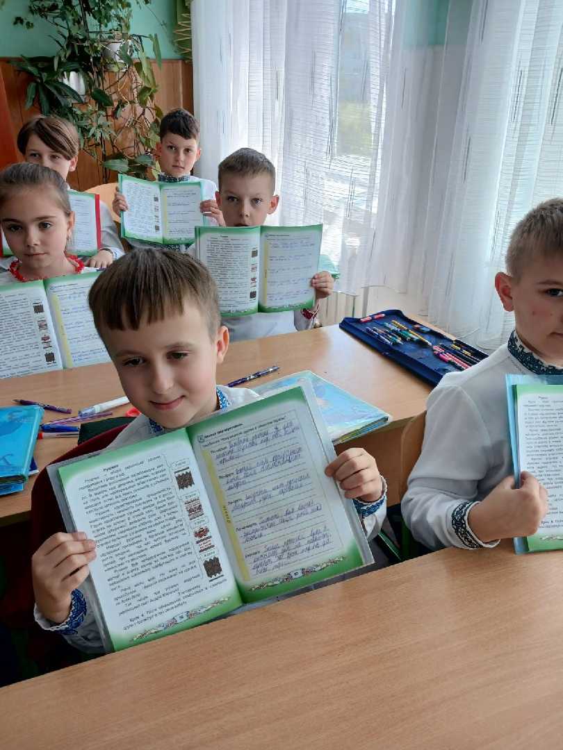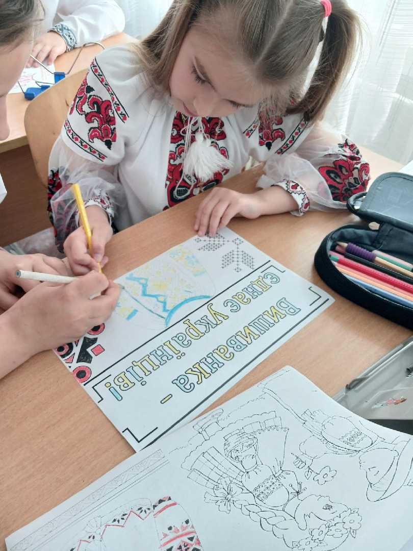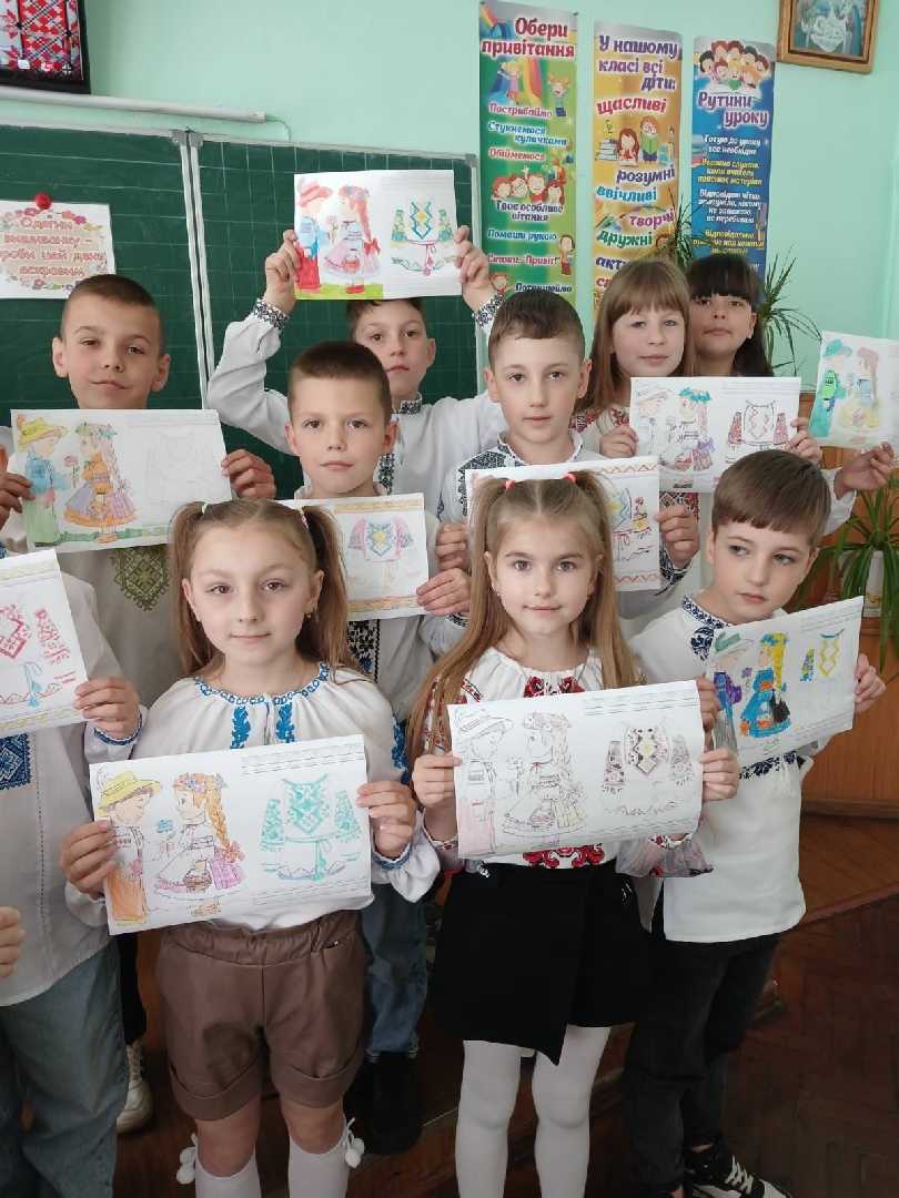Учитель початкових класів Бац В.І. провела для учнів 3-Б класу урок ,, А над світом українська вишивка цвіте". Школярі створювали ілюстрації українських вишиваних сорочок, розповідали легенди про кольори на рушниках, писали твір про значення вишиванки у житті українців.