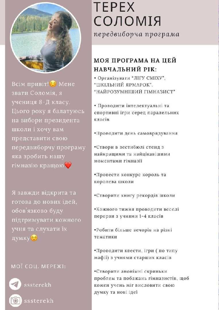 Щиро вітаємо новообрану президентку Гімназії № 12 Терех Соломію із перемогою на виборах. Нехай у наступному навчальному році вдасться реалізувати все заплановане!