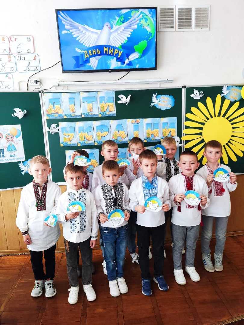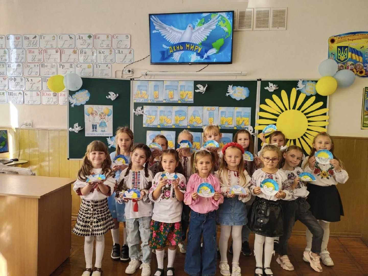 21вересня весь світ відзначає Міжнародний день миру, який є символом надії та співчуття для мільйонів людей, які прагнуть завершення збройних конфліктів та побудови світу без війн та страждань. Особливо це відчуття нині актуальне для нас – українців. Відзначаючи День миру учні 1-В класу( вчитель Єдинак О.І., асистент вчителя Піляк І В.) ознайомилися з історією виникнення цього свята, робили аплікацію "Я хочу миру!", виконали руханку "Буде мир над Україною!" і бажають всім мирного неба над головою!