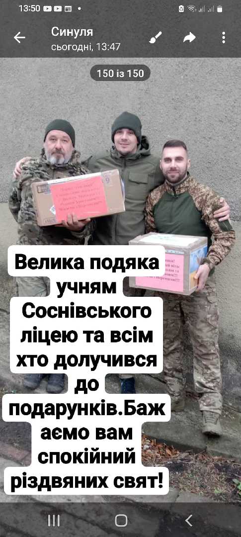 З нагоди Дня Збройних сил України, Дня святого Миколая та Різдва Христового з ініціативи Шкільного Містечка було проведено акцію "Подаруй воїну свято". Учасники освітнього процесу нашого ліцею з радістю зібрали коробки-подарунки для наших захисників: солодощі, каву, чай, продукти швидкого приготування, теплі речі, засоби гігієни, малюнки та листи з побажаннями. Більшість подарунків віддали Спілці ветеранів АТО ООС м. Соснівки, які якраз вирушали на Схід, а також новою поштою були відправлені персональні подарунки для воїнів-випускників школи. Дякуємо усім учасникам акції за небайдужу громадянську позицію