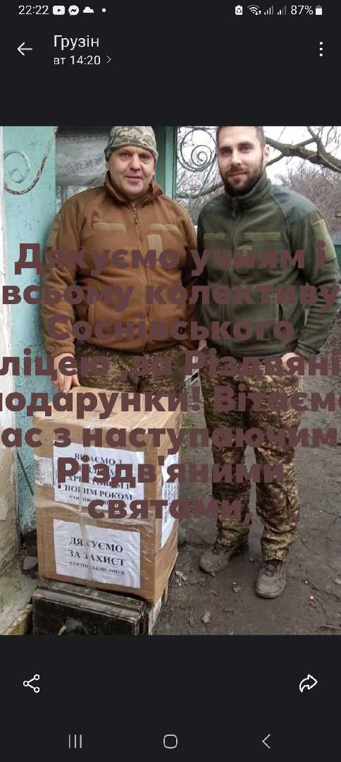 З ініціативи Шкільного Містечка учасники освітнього процесу нашого ліцею зібрали коробки-подарунки для захисників, які зараз боронять державу на Сході. Дякуємо усім за небайдужу громадянську позицію. Більшість подарунків віддали Спілці ветеранів АТО ООС м. Соснівки, які вирушали на Схід, а також передані подарунки воїнам - випускникам школи. Дякуємо вам, наші ГЕРОЇ