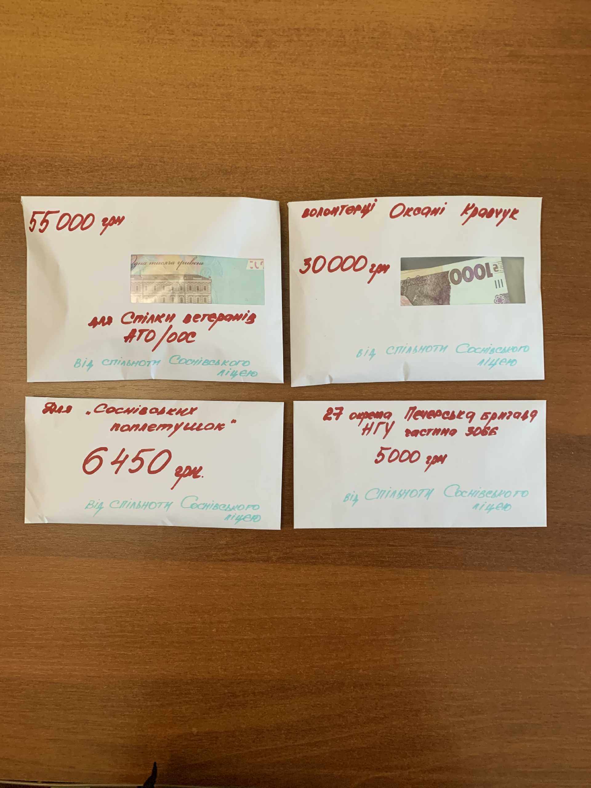 У четвер, 16 квітня, під час проведення урочистої лінійки, директор ліцею Катарина І. М. оголосила, що завдяки участі всіх учасників освітнього процесу вдалося зібрати 96тис. 450 грн, з яких передано 55 тисяч грн Спілці ветеранів АТО/ООС м. Соснівки, 30 тисяч грн волонтерці Оксані Кравчук, 6тис.450 грн "соснівським поплетушкам", 5 тисяч грн випускнику школи Турку Євгену для 27 окремої Печерської бригади НГУ (част. 3066). Голова батьківського комітету Кузьмів Іванна (мама учня 5 гімназійного класу (класний керівник Теслюк Н. Ю.), учні якого вже четвертий рік поспіль є найактивнішими та зібрали найбільшу суму коштів 14 тис. 400 грн) теж подякувала учням та їхнім батькам за небайдужість, свідомість та бажання творити добро заради миру: "Віримо, що кожна гривня і кожне зусилля наближають нашу перемогу. Нехай кожен учень дочекається свого батька, брата, а кожна мама - свого сина живими і неушкодженими".