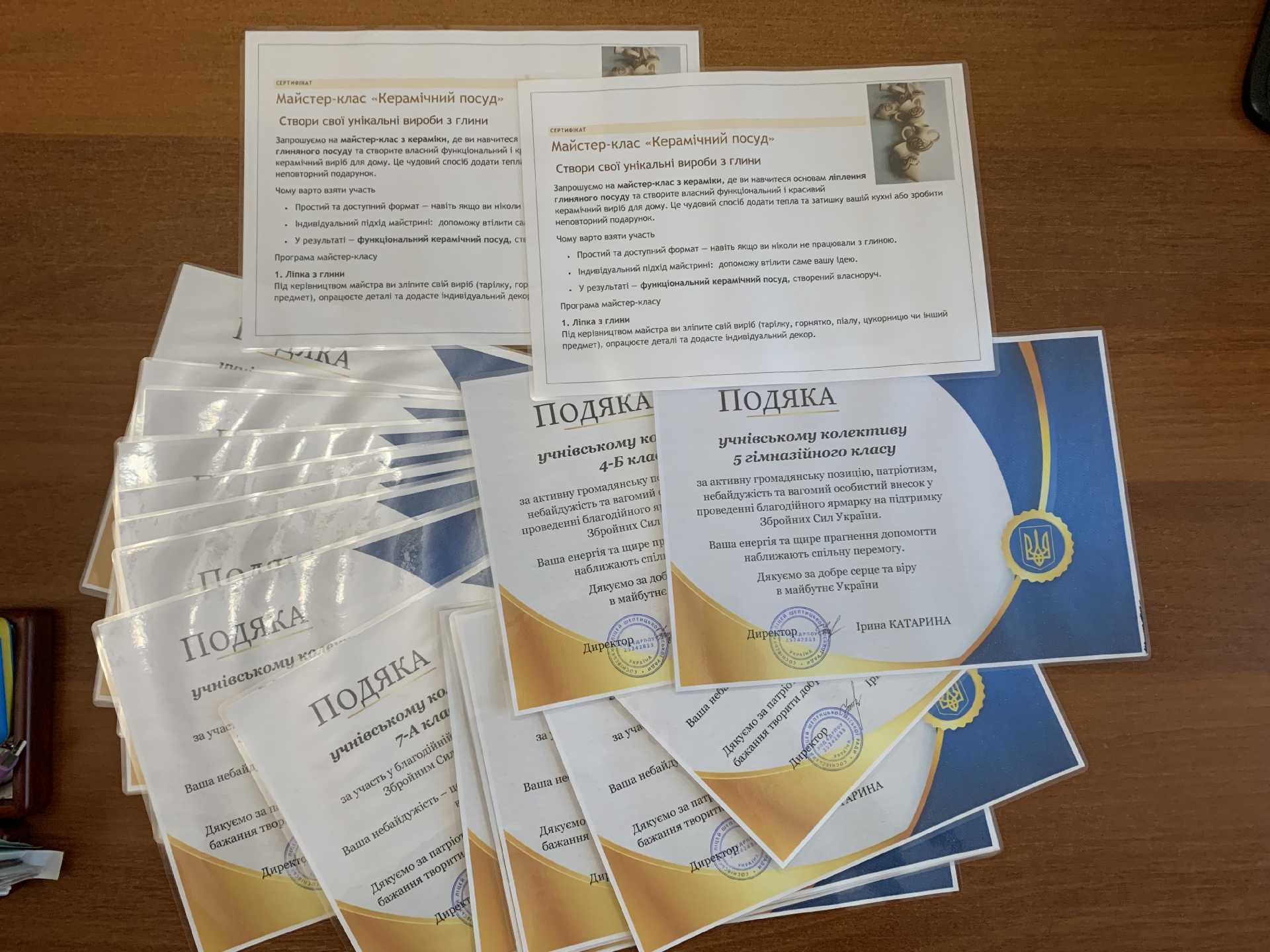 Усі класи-учасники ярмарку нагороджені Подяками, а учнів 5 гімназійного класу та 4-Б класу ще й Сертифікатами на майстер-клас "Керамічний посуд", який проведе митець Державної спілки народних майстрів України Мартинович Оксана Ярославівна.