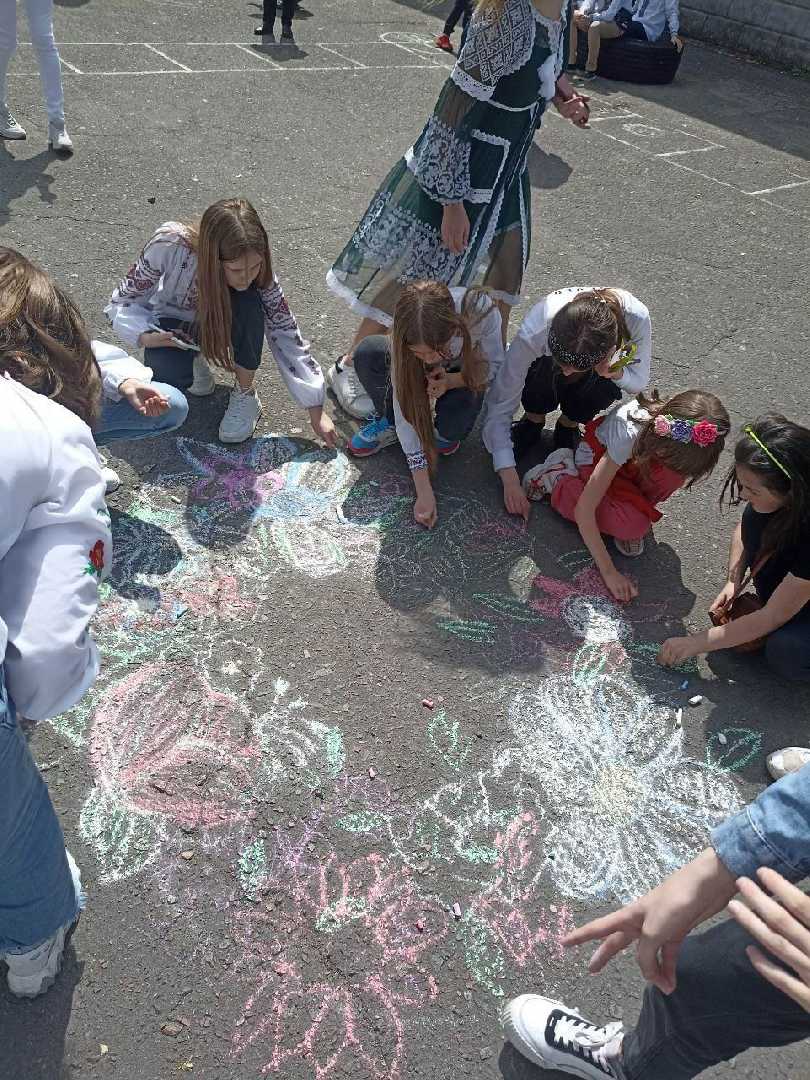 Діти водили веснянки, брали участь у різних конкурсах, із захопленням малювали фарбами узори для рушників, виготовляли вишиванки з паперу за допомогою аплікації, з цікавістю виконували завдання квесту та малювали віночки українських символів на асфальті.