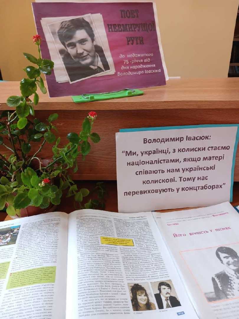 До 75 років від дня народження Володимира Михайловича Івасюка для учнів 6 класу проведено виховний захід (зав. бібліотеки Малиш Л.П.) , а також оформлена виставка-портрет "Поет невмирущої рути".
