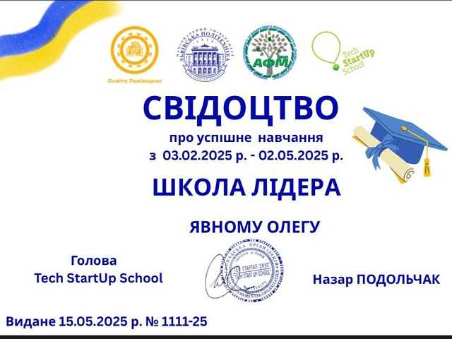 Вітаємо нашого гімназиста Явного Олега з отриманням сідоцтва про успішне навчання #Школи_лідера, яке відбувалося в онлайн-форматі на базі НУ "Львівська політехніка"/
