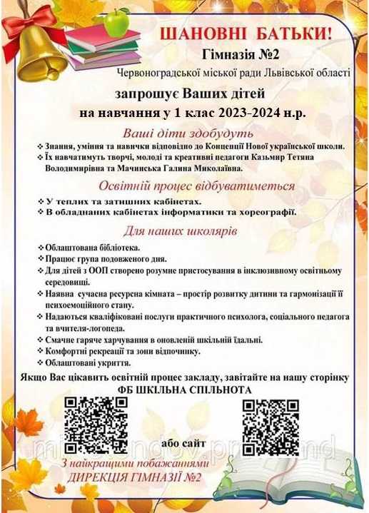 Шановні батьки майбутніх першокласників! Гімназія №2 радо прийме ваших діток на навчання у 1 клас у 2023-2024 н.р. Ви станете частиною нашої дружньої гімназійної родини.