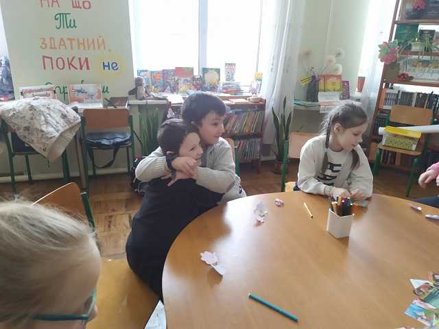 Діти розказували про себе, свої улюблені заняття, висловлювали свої думки, почуття через мову образів, представлених на картинках. Також учні слухали цікаві історії, які вчать поважати і підтримувати своїх ближніх, допомагати один одному. Потім робили браслети, заряджали їх добром, позитивом, теплом і дарували тим, кого люблять. Діти намалювали свій настрій, обмінялися обіймами, а потім всі загадали бажання. Як виявилося, в наших дітей є тільки одне бажання - Перемога.