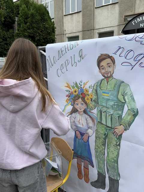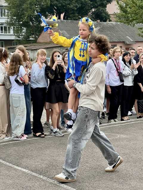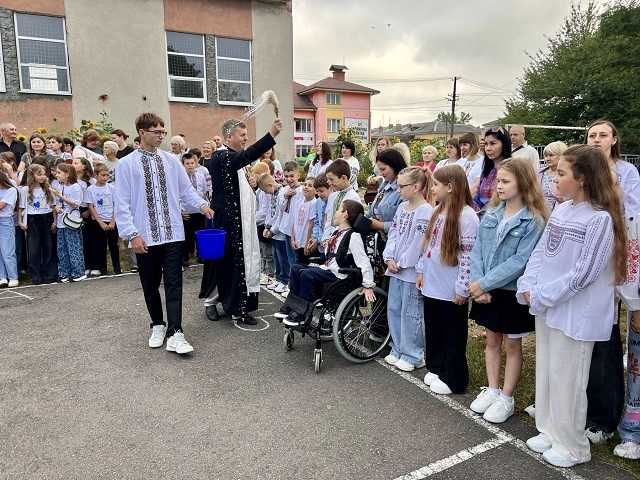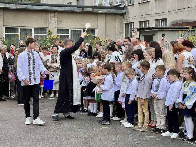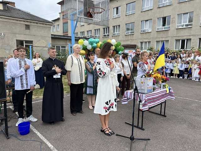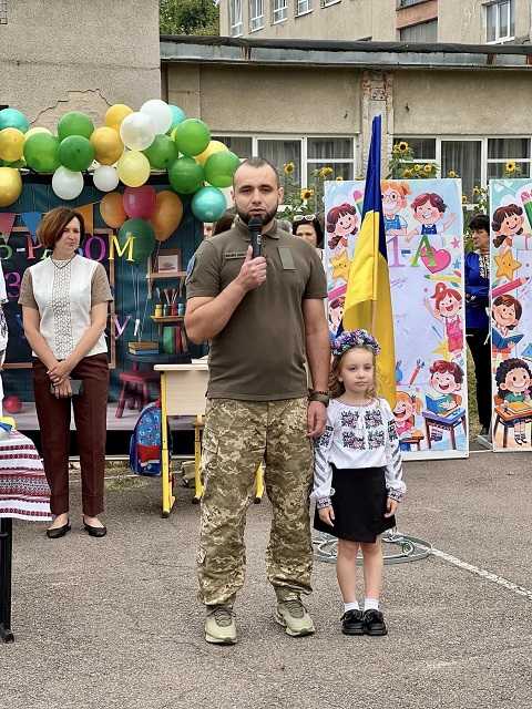 Отець Михайло благословив дітей та вчителів, а воїн 103-ї бригади ТРО Андрій Шевчук, який сьогодні привів до гімназії похресницю, побажав успіхів і сили у навчанні.