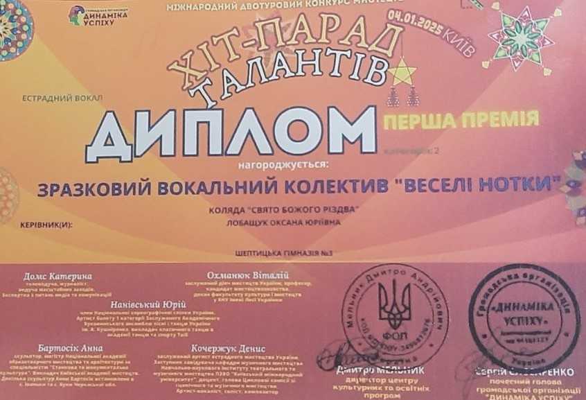 Зразковий вокальний колектив "Веселі нотки" розпочав 2025 рік з високої ноти! Адже учасники середньої групи брали участь у міжнародному конкурсі мистецтв "ХІТ-ПАРАД ТАЛАНТІВ" м. Київ 04.01.2025 і отримали І премію! Підготувала учнів керівник Лобащук О. Ю.