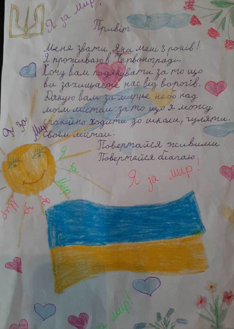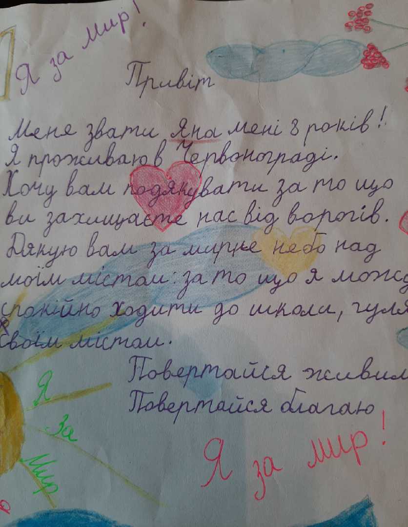 Діти намалювали малюнки, листівки, написали теплі листи воїнам, які захищаючи нашу землю, отримали поранення і зараз лікуються у Харківському військовому госпіталі.