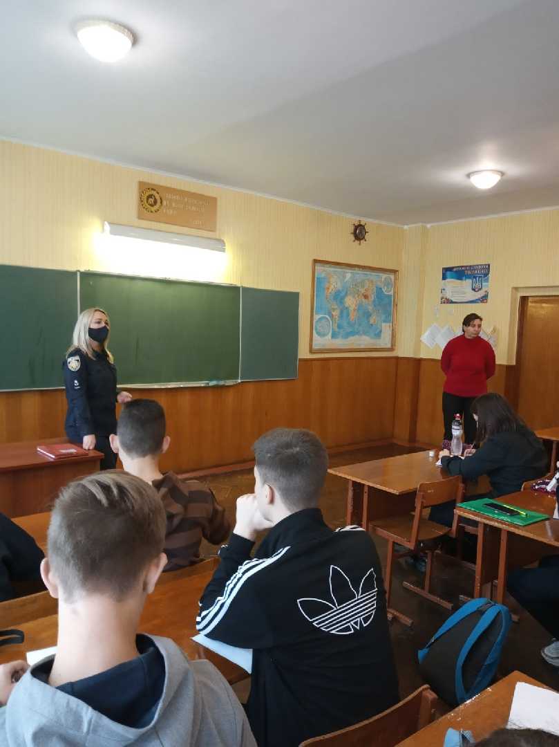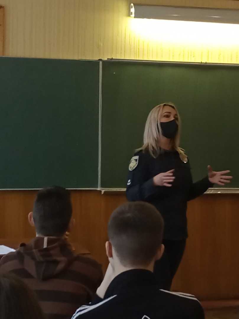 З візитом до учнів 9-Б класу завітала майор поліції Панасюк І. С. Зустріч відбулася в теплі атмосфері, дискутуючи майор наводила реальні приклади з життя учнів, нагадала дітям основні правила безпечної поведінки, розповіла про конкретні неприємні ситуації, у які можна потрапити через власну необережність, і як їх уникнути.