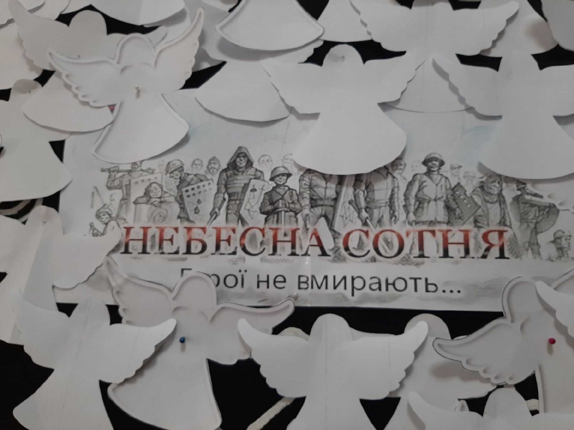Учні 5-7 класів оформили панно білими ангелами, що піднімаються у небо і символізують душі загиблих патріотів України.