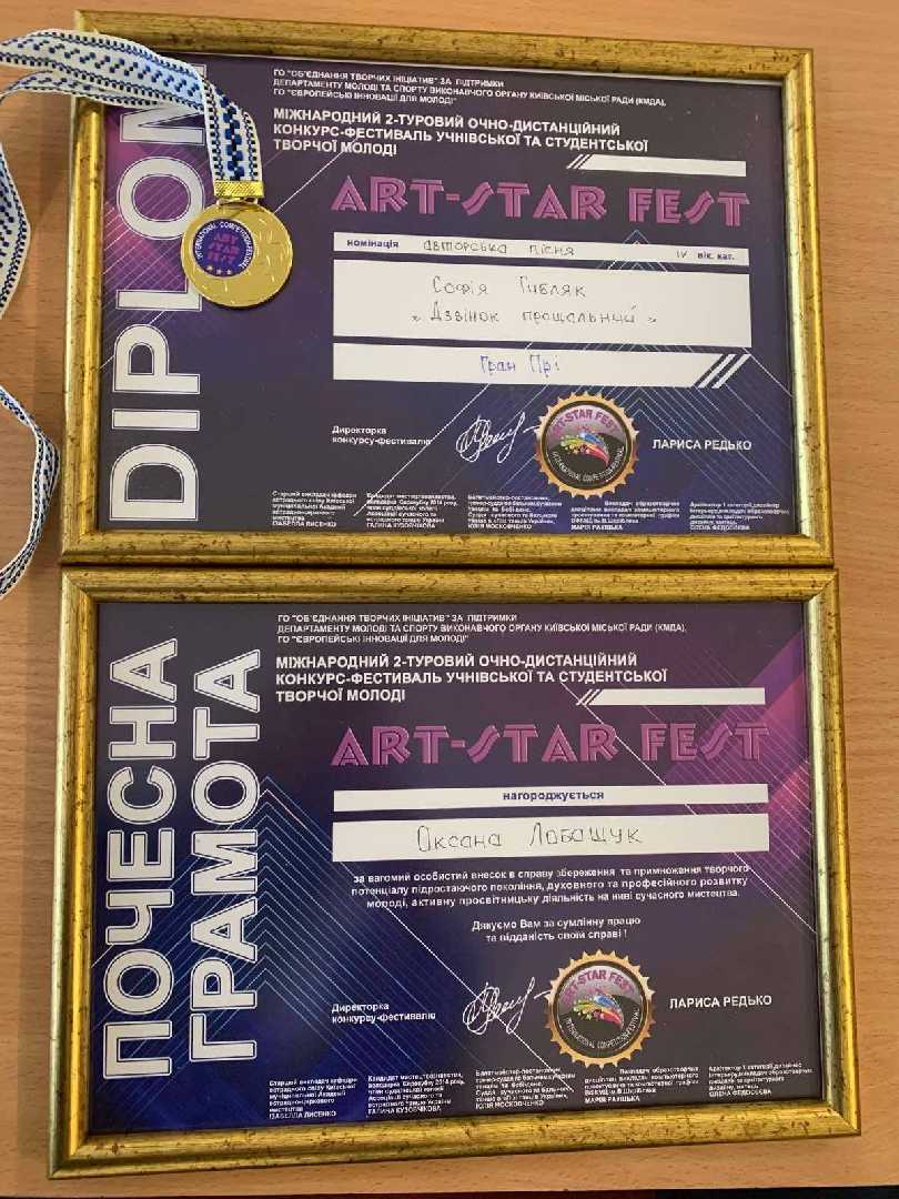 Номінація - авторська пісня "Дзвоник прощальний". Результат приємно вразив- найвища нагорода Гран Прі! Підготувала Софію вчитель Лобащук Оксана Юріївна, яка теж відзначена почесною грамотою за сумлінну працю та відданість своїй справі.