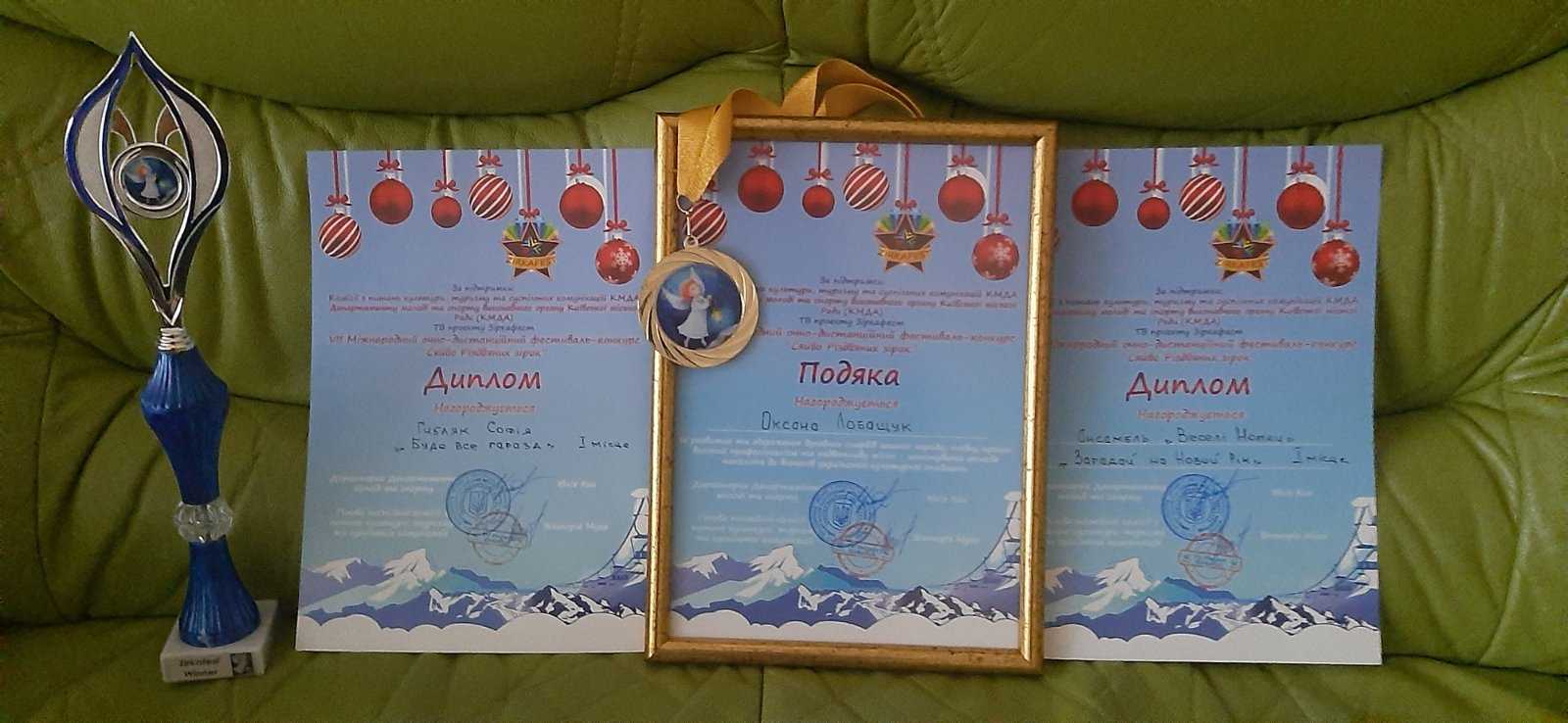 Нашу шкільну родину потішила звістка, яку приніс зразковий вокальний колектив "Веселі нотки" та Гибляк Софія, учениця 11-А класу. Вони прийняли участь в VII Міжнародному очно- дистанційному фестивалі- конкурсі "Сяйво Різдвяних зірок" м. Київ. Гибляк Софія з піснею "Буде все гаразд" отримала І місце, а зразковий вокальний колектив "Веселі нотки" виконував пісню "Загадай під Новий рік" та також перемога - І місце! Підготувала учнів керівник Оксана Лобащук. Вітаємо наших переможців! Творчих їм злетів!