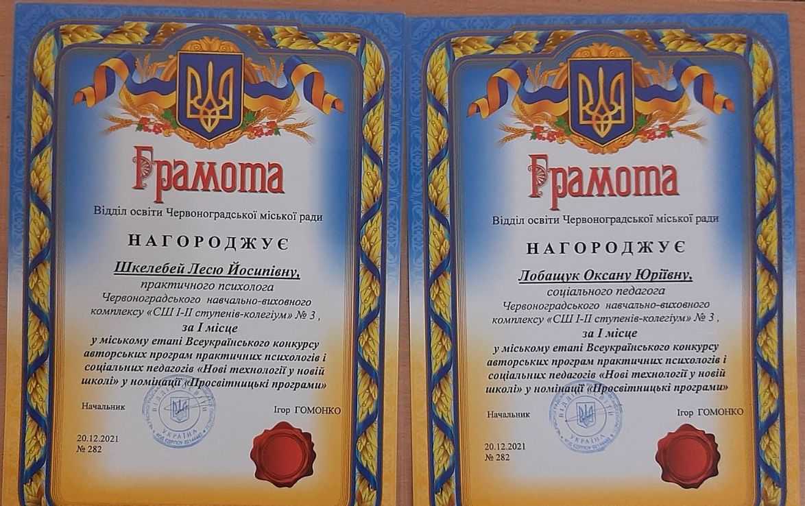 Вітаємо соціального педагога Оксану Лобащук та практичного психолога Лесю Шкелебей із зайнятим І місцем у міському етапі Всеукраїнського конкурсу авторських програм " Нові технології у новій школі" у номінації "Просвітницькі програми".