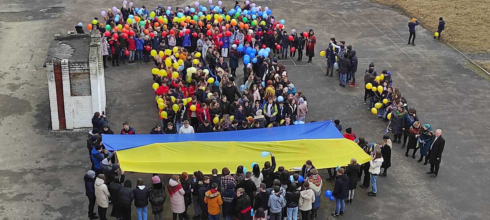 Сьогодні, у День єднання, на площі перед Червоноградським колегіумом в єдиному пориві вчителі, учні, обслуговуючий персонал виконали державний гімн «Ще не вмерла України..» Серце дитини і серце дорослого злилися в єдине велике і сильне почуття – ми українці і Україна в нас – одна. З ніжністю і великою любов’ю був розгорнутий дев’ятикласниками десятиметровий синьо-жовтий прапор, а учні 7-8 класів створили живий герб України в національних кольорах.