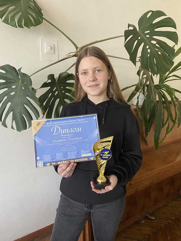 Вітаємо нашу талановиту вчительку Пляцко О.Я. та її вихованку Анастасію Десятник ще з однією перемогою у міжнародному мистецькому конкурсі "Ти майбутнє України" і бажаємо їм натхнення, творчості й нових здобутків. Так тримати!!! Гордимось вами. Хай щастить. Вперед, до нових перемог