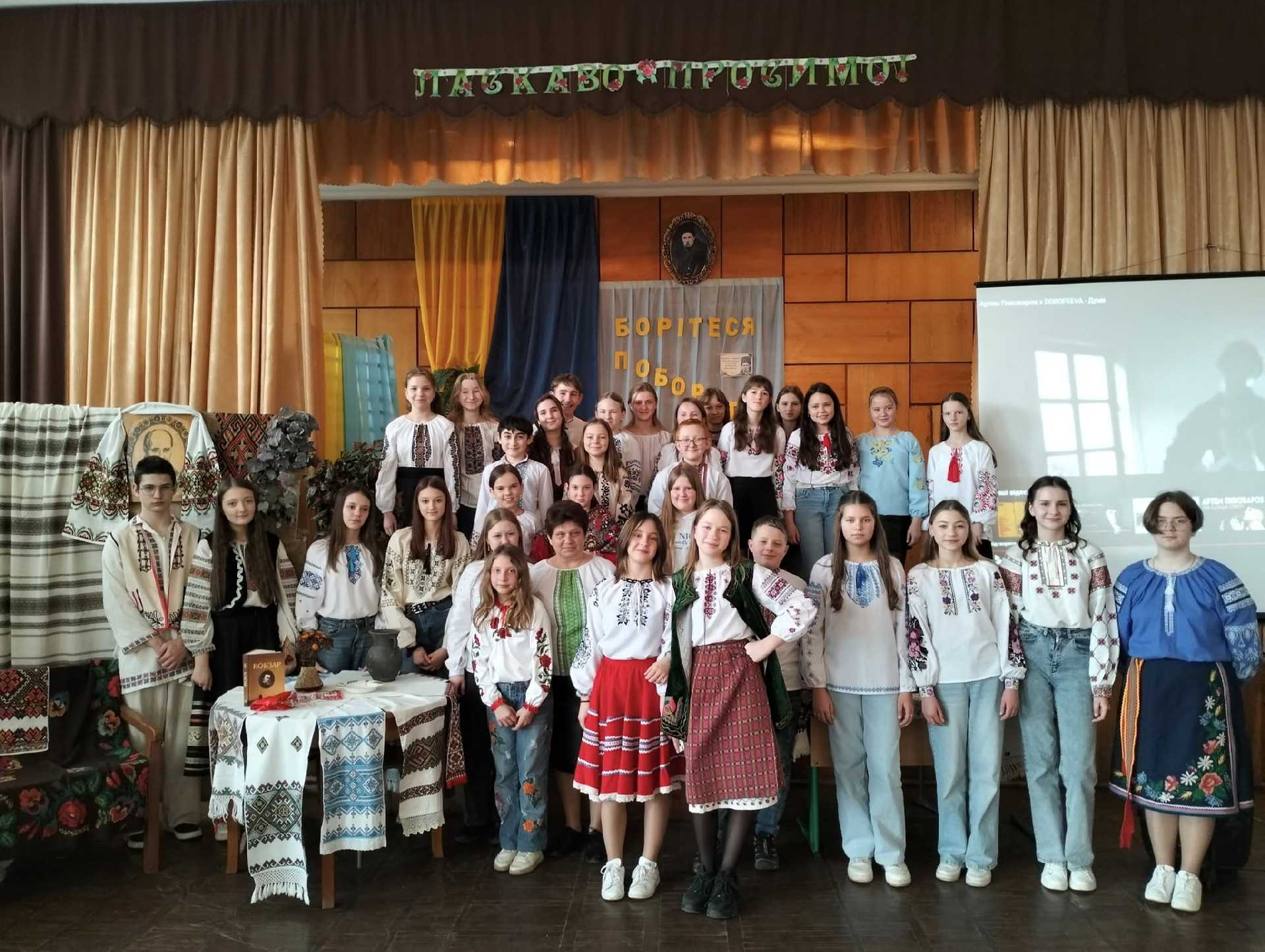 В Україні жив Т. Шевченко . Ні, він і сьогодні живе. Він вчить нас любити Україну так, як він любив. Він просить нас зберегти і збагачувати рідну мову. "Борітеся- поборете , вам Бог помагає "- ми сьогодні розуміємо його слова , які були написані у 19 ст. У нашій школі був проведений захід учнями 6, 8 класів " Дитинство Шевченка. Перехресні шляхи долі".