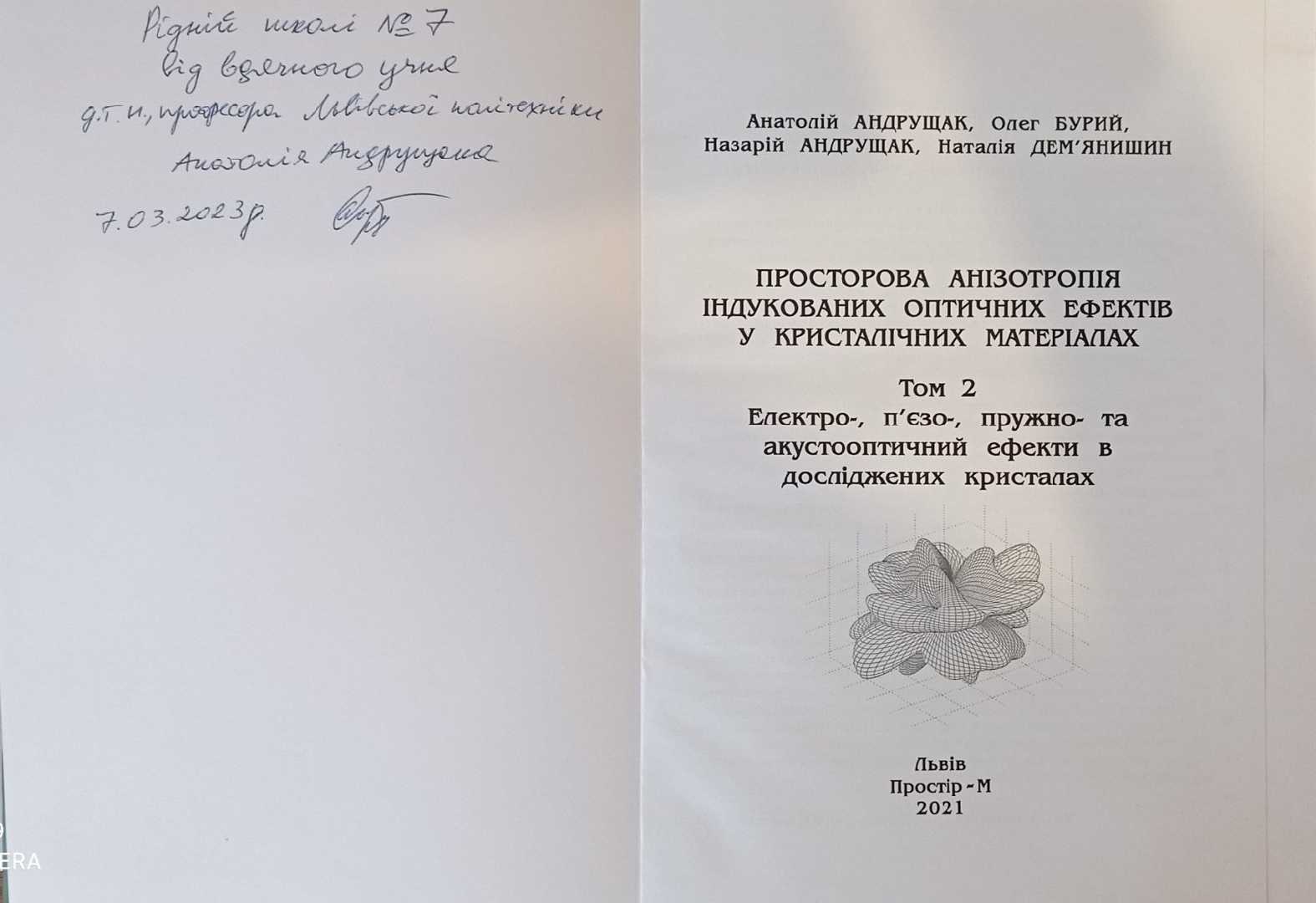 Цього тижня навідати своїх вчителів приїхав колишній учень школи, а зараз завідувач кафедри прикладної фізики і наноматеріалознавства Інституту прикладної математики та фундаментальних наук Львівської політехніки, доктор технічних наук, професор Анатолій Андрущак. Він привітав всіх педагогів та на згадку про себе подарував свою працю - монографію "Просторова анізотропія індукованих оптичних ефектів у кристалічних матеріалах" у двох томах.