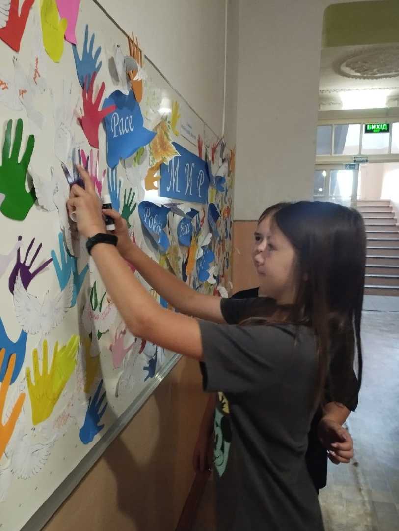 Цього дня кожен учень Соснівської загальноосвітньої школи І-ІІІ ступенів №7 залишив свою долоньку як знак єднання задля миру України та всього світу, а учні початкових класів написали на білих голубах, що для кожного з них означає мир: