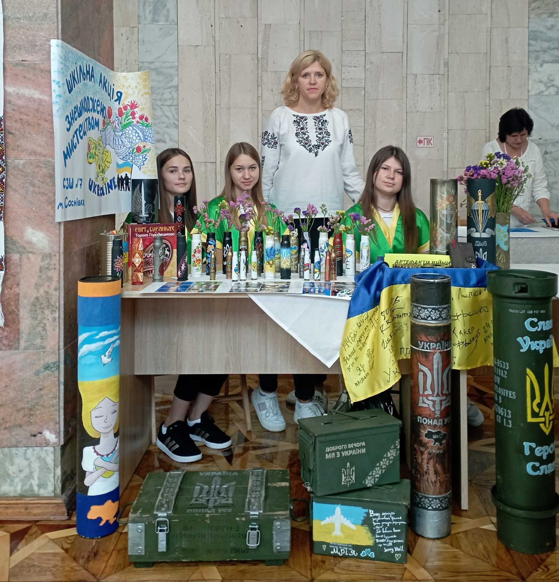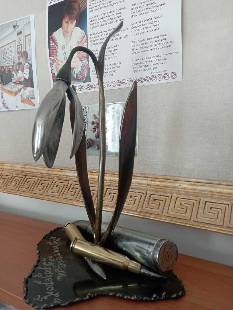 Разом з ученицями 9 класів - Анною Челядою, Софією Білань та Діаною Харіновою на огляд червоноградців були представлені нові роботи, а всі отримані від продажу кошти передані на потреби ЗСУ. Особливу гільзу, тонко розмальовану Анною Челядою на згадку про наш проєкт Анна Малицька подарувала музею Тараса Городецького.