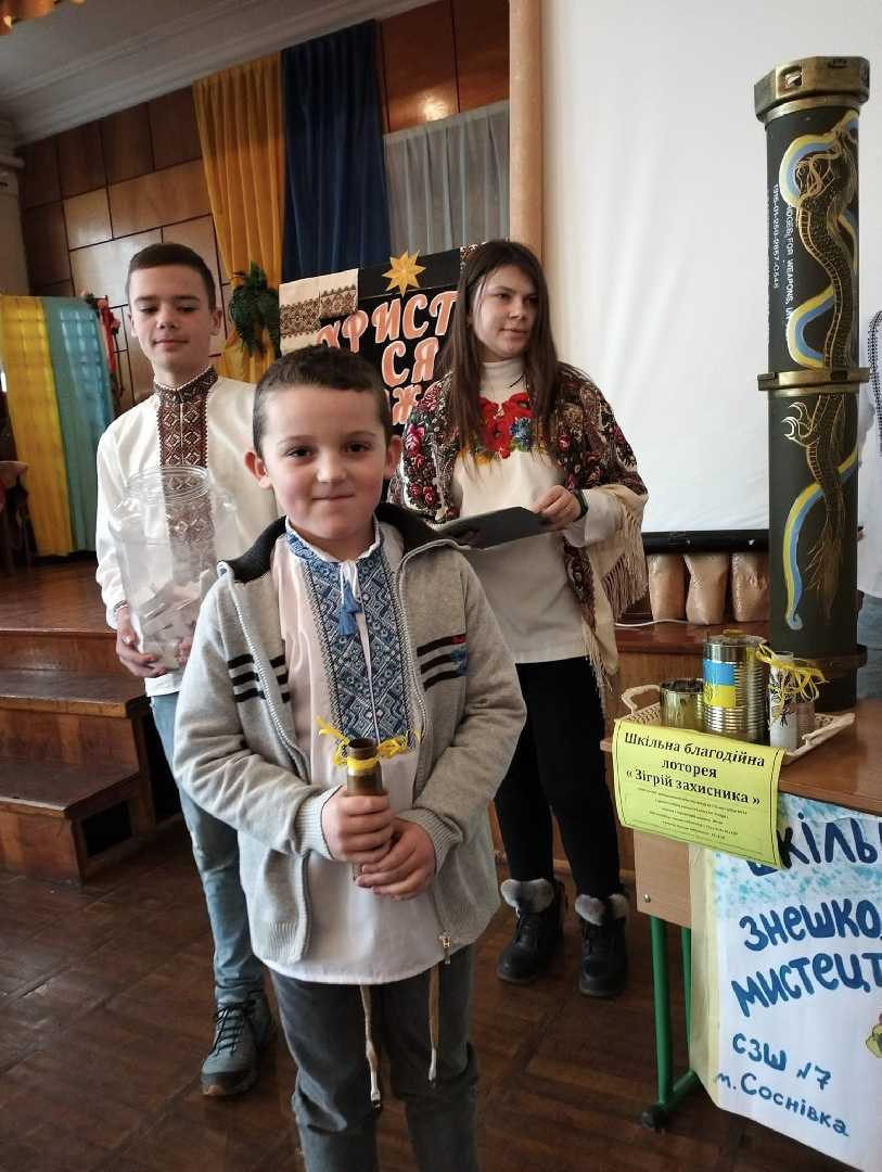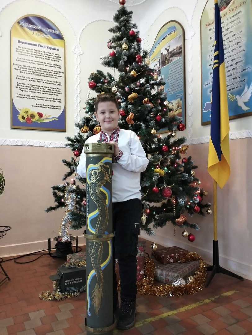 Під час Свята Коляди в нашій школі відбувся розіграш нашої благодійної лотереї " Зігрій захисника". Головний приз - розмальований тубус від заряду до 155 - мм гаубіци М 777 отримав учень 4-б класу МИХАЙЛИК Олександр !