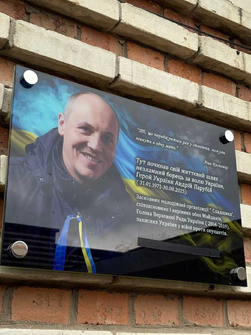Сьогодні, на фасаді навчального закладу урочисто відкрили меморіальну дошку та вшанували пам'ять про громадського діяча, народного депутата, Голови Верховної Ради України, Героя України та патріота Андрія Парубія.