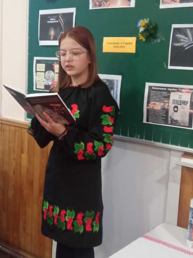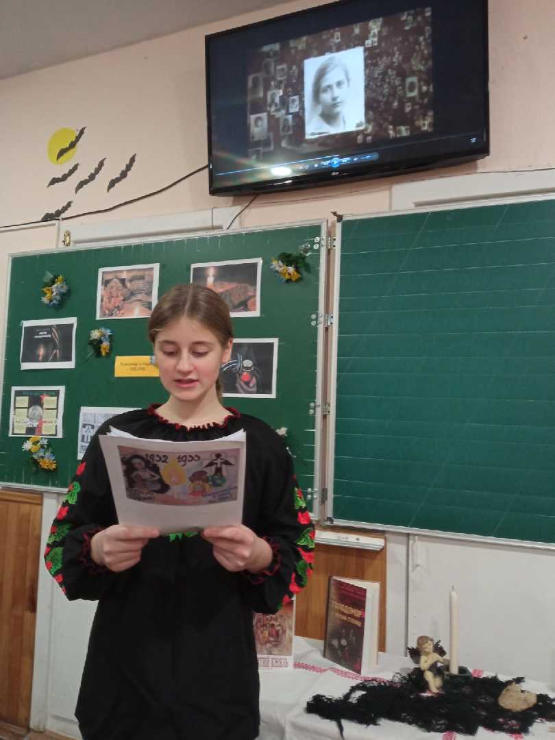 Учні 7-А класу (кл.кер.Коломієць Л.В.) провели виховний захід «Пам’ятаємо.Єднаємося. Переможемо». Школярі вшанували пам’ять померлих від голоду, запаливши свічки та лампадки під скорботні звуки реквієму, вшанували пам’ять безневинно убієнних Голодомором хвилиною мовчання. Цей день став для дітей днем спільного болю, нагадав присутнім, що життя людини -найцінніший дар, дорожчий за всі цінності на землі. Україно! Матінко! Чому тебе століттями розпинають, катують, знищують? Скільки ще? Сльози на очах викликав перегляд короткометражного фільму «Червоне намисто», сюжет якого заснований на реальній історії 7-річної дівчинки, яка пережила недитяче випробування голодом у 1932-33 роках. Та незважаючи на страшний укіс Голодомору Україна несе Свічу пам’яті, а головне продожує жити. І запалений вогник у вікні – вияв скорботи за загиблими та віра в перемогу українців.