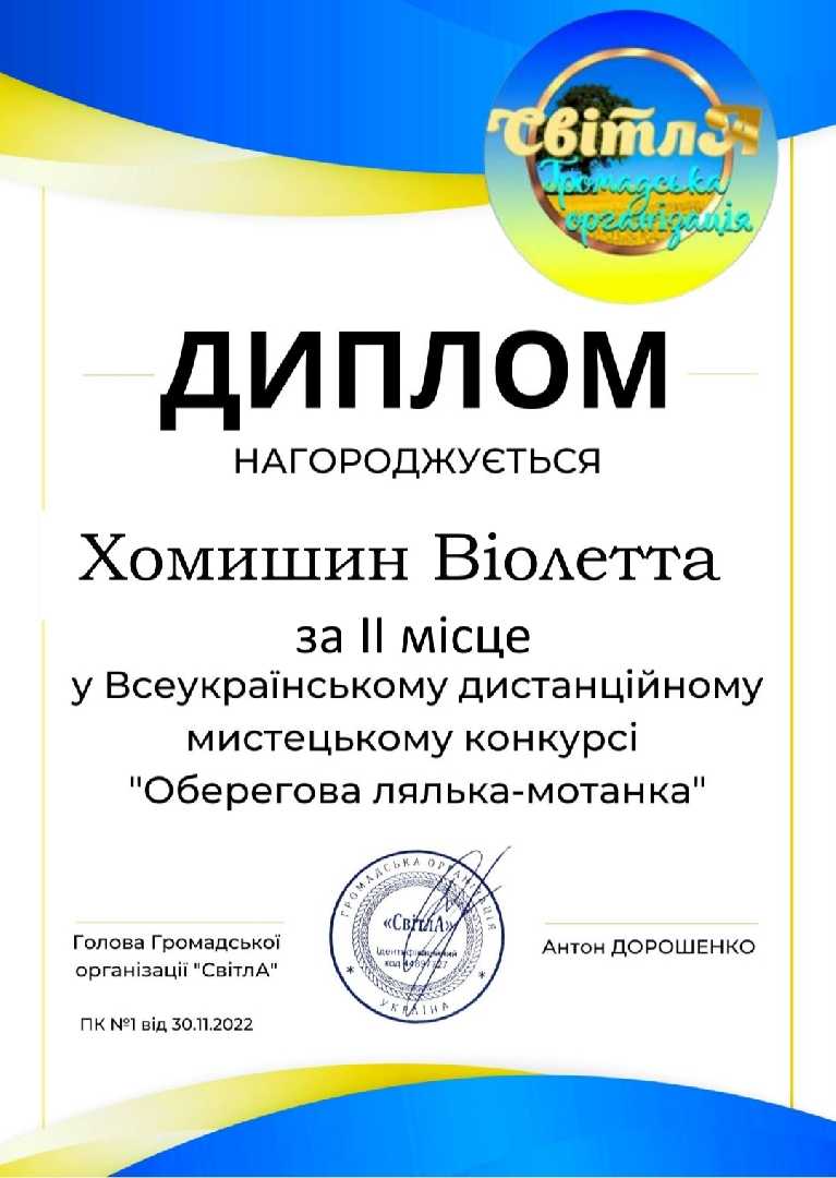 Напередодні Дня Збройних Сил України Хомишин Віолетта, учениця 8 класу, отримала диплом за зайняте ІІ місце у Всеукраїнському дистанційному мистецькому конкурсі "Оберегова лялька-мотанка".