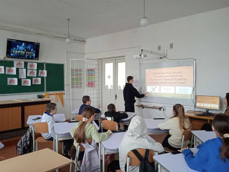присвятили сьогодні класні керівники урок Мужності. А ще під час перерви учні змогли відвідати кінолекторій "Крути - символ героїзму українського юнацтва", брали участь у вікторині.