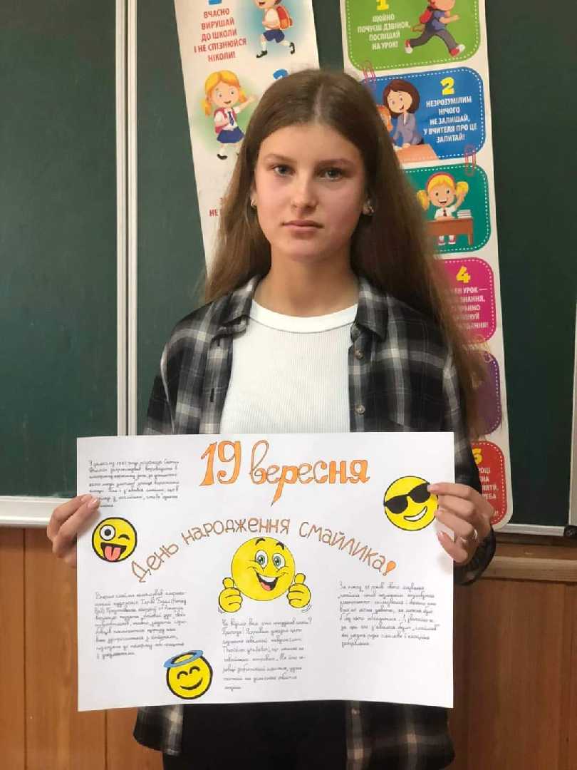 Цього року члени учнівського самоврядування вирішили відзначити цей день в нашій школі. Учасники шкільного парламенту розповіли про винекнення смайлика, побажали всім дітям і вчителям гарного настрою та щирих посмішок. Якщо ви хочете, щоб життя посміхалося вам, подаруйте йому спочатку свій гарний настрій.
