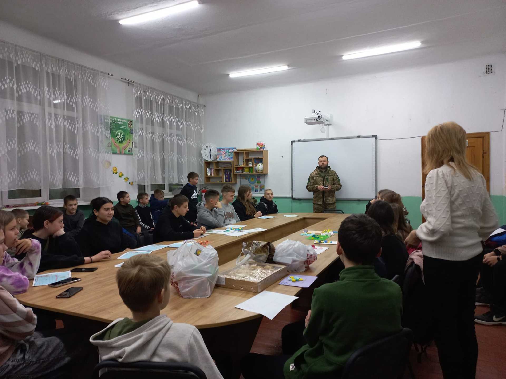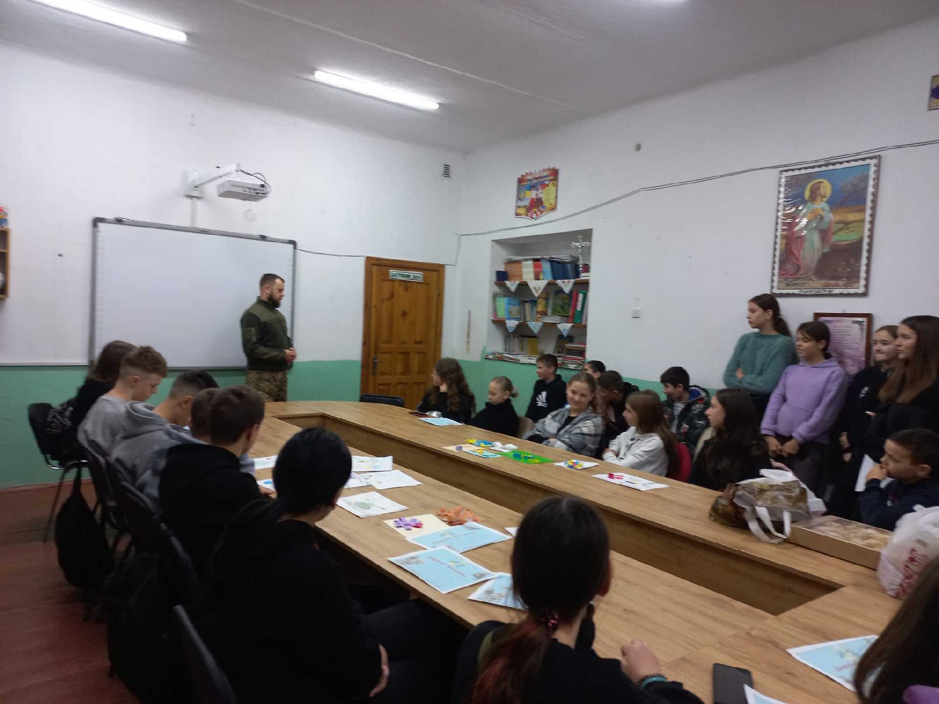 Напередодні Дня Збройних сил України до гімназії завітав наш випусник Спільник Андрій, котрий з перших днів війни пішов добровольцем захищати рідну землю. Поспілкувався з учнями та вчителями, пригадав шкільні роки та коротко розповів про суворі реалії життя. Діти розпитували воїна про службу, написали захисникам листи, подарували малюнки та солодощі і побажали Герою якнайшвидше повернутися додому з Перемогою. Слава Збройним Силам України!!!