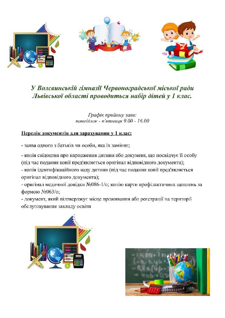 У Волсвинській гімназії Червоноградської міської ради Львівської області проводитись набір дітей у 1 клас.