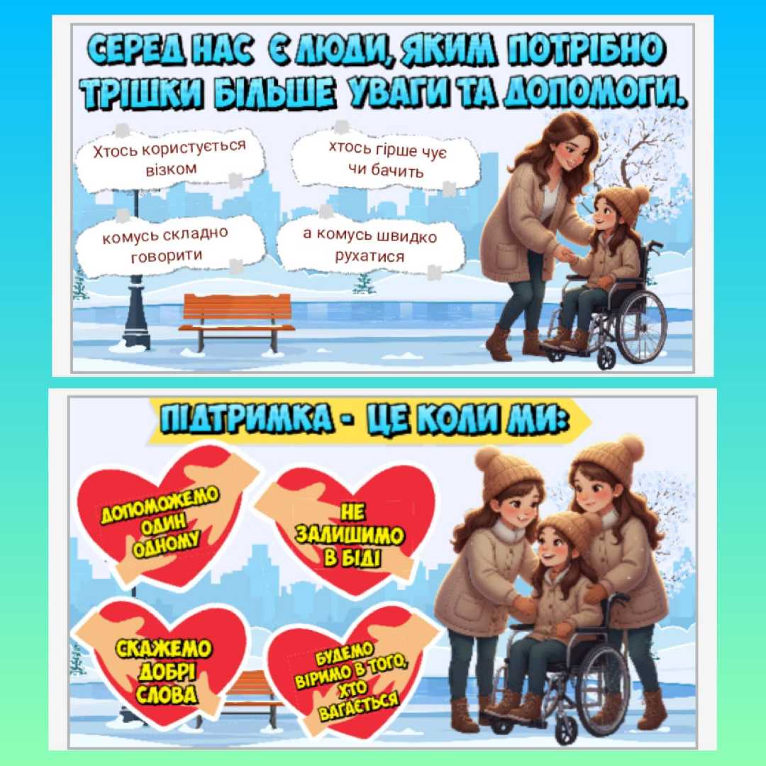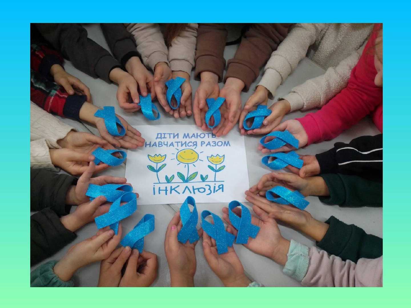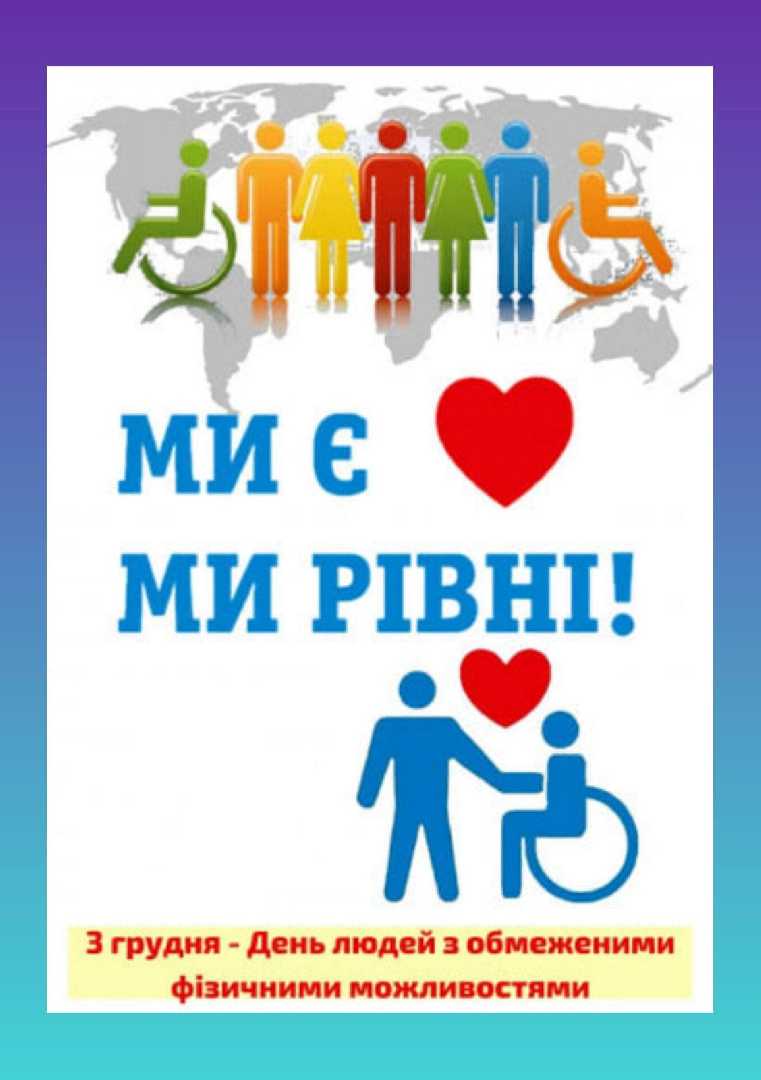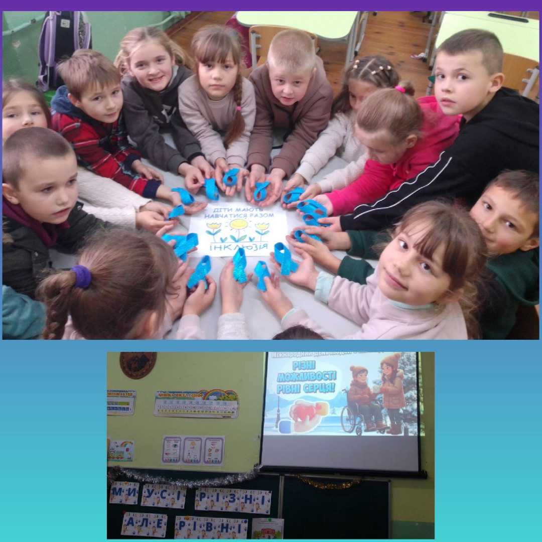 Міжнародний день людей з інвалідністю (3 грудня) Практичний психолог Лесик О. А. провела заняття з учнями 3 класу на тему “Різні можливості — рівні серця” В ході перегляду презентації діти зрозуміли: - що таке "людина з особливими потребами" - що таке "інклюзія" - чому всі люди рівні - як проявляти підтримку та повагу - які існують допоміжні засоби - чому протези — це не страшно, а круто Як прояв толерантності до осіб з особливими потребами, діти підготували повітряні кульки синього і білого кольорів,що є символічними для цього дня . Також учні виготовили сині стрічки – міжнародний символ захисту дітей від насильства у всіх його проявах.