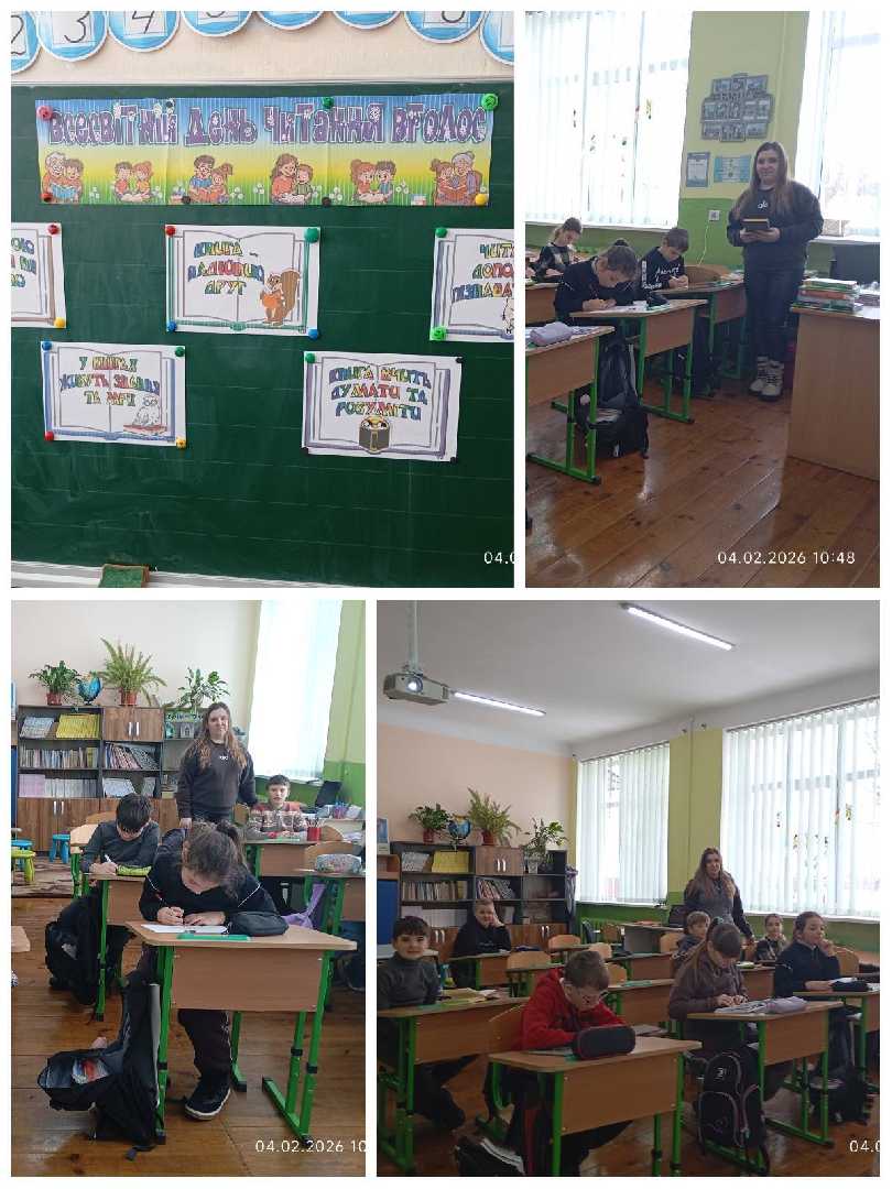 Щороку у першу середу лютого світ відзначає неймовірне свято — Всесвітній день читання вголос. Читання — це суперсила, яка завжди з нами: вона дарує знання, емоції, відпочинок та натхнення. Сьогодні ми не просто читаємо — ми ділимося історіями. І тому бібліотекар Саїк В.О. провела у 4 класі заняття до цього дня . Діти подивилися презентацію про історію свята, прочитали вголос свої улюблені уривки з книжок та розфарбували розмальовки на цю тематику.