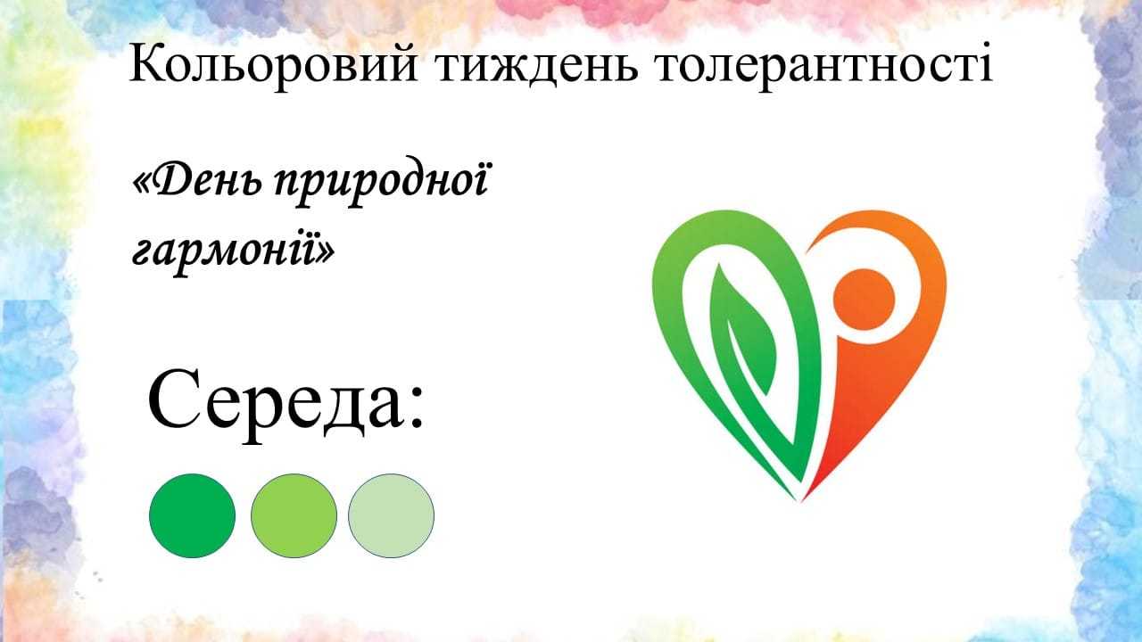 "Кольоровий тиждень толерантності" СЕРЕДА - День природної гармонії. (Кольори: зелений, салатовий, м'ята).