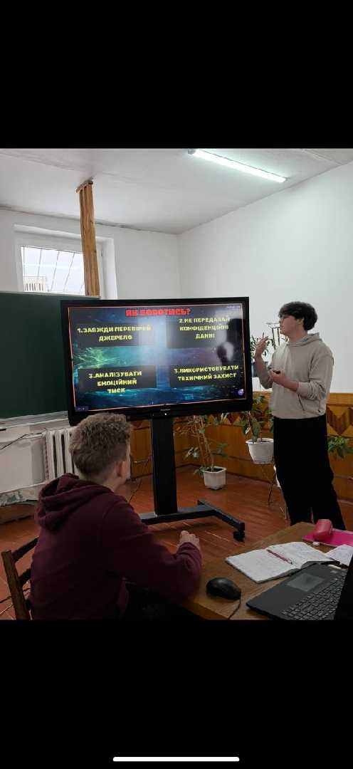 Особливу увагу приділили темі фейків і діп фейків — як розпізнати неправдиву інформацію, перевіряти джерела, критично оцінювати фото- та відеоматеріали. Десятикласники дізналися, як сучасні технології можуть створювати переконливі, але неправдиві зображення й відео, та чому важливо не поширювати неперевірений контент.