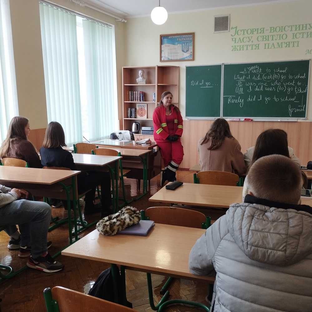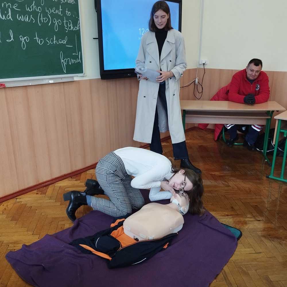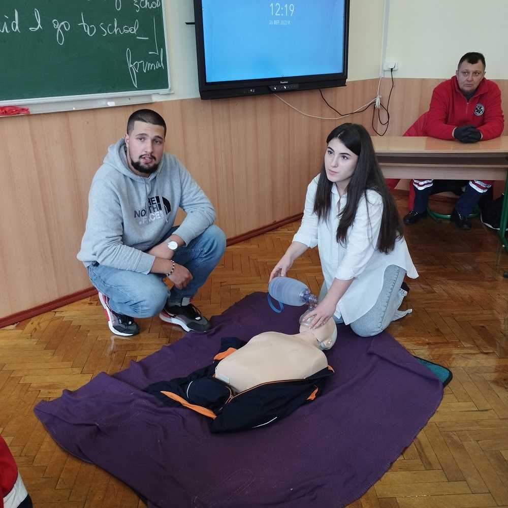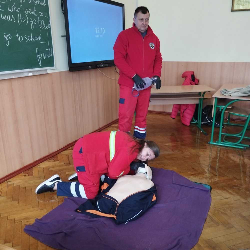 Медики продемонстрували, як надати першу невідкладну медичну допомогу при втраті свідомості, ураженнях струмом і т.д. Учні мали змогу побачити медичні засоби першої необхідності: джгути, турнікети, маска-клапан для штучної вентиляції легенів, мішок повітряний (мішок Амбу).