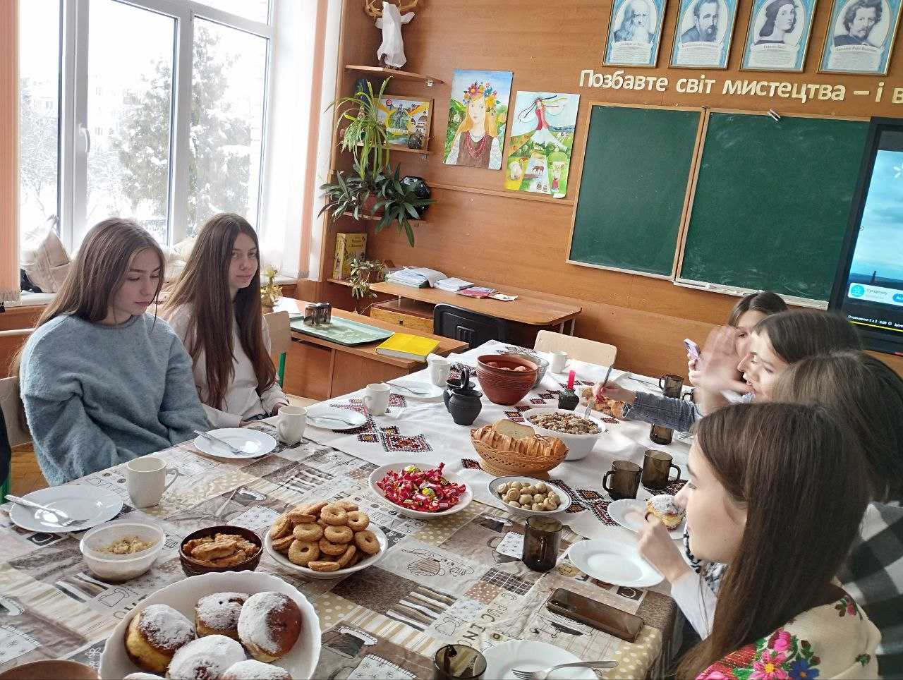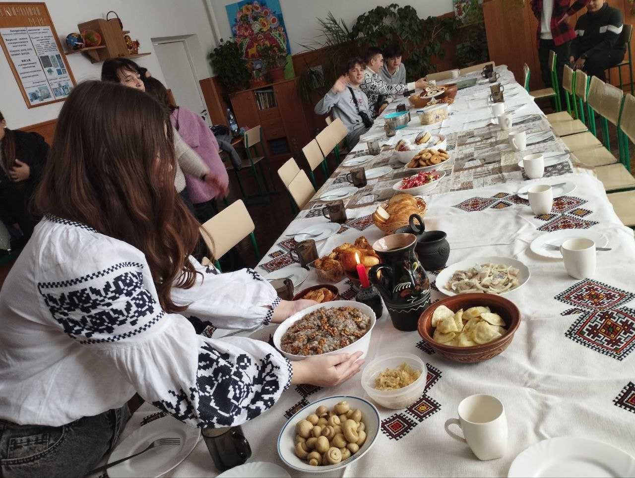 Учні 10-Д2 класу разом із класним керівником Кузьмою Л. Б. відроджували 12 страв Святої вечері. Дівчата й хлопці у вишиванках, накрили святковий стіл: кутя, пісні вареники і голубці, грибна юшка, пампухи, узвар........ Дванадцять страв, як і дванадцять апостолів.