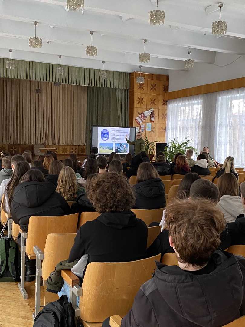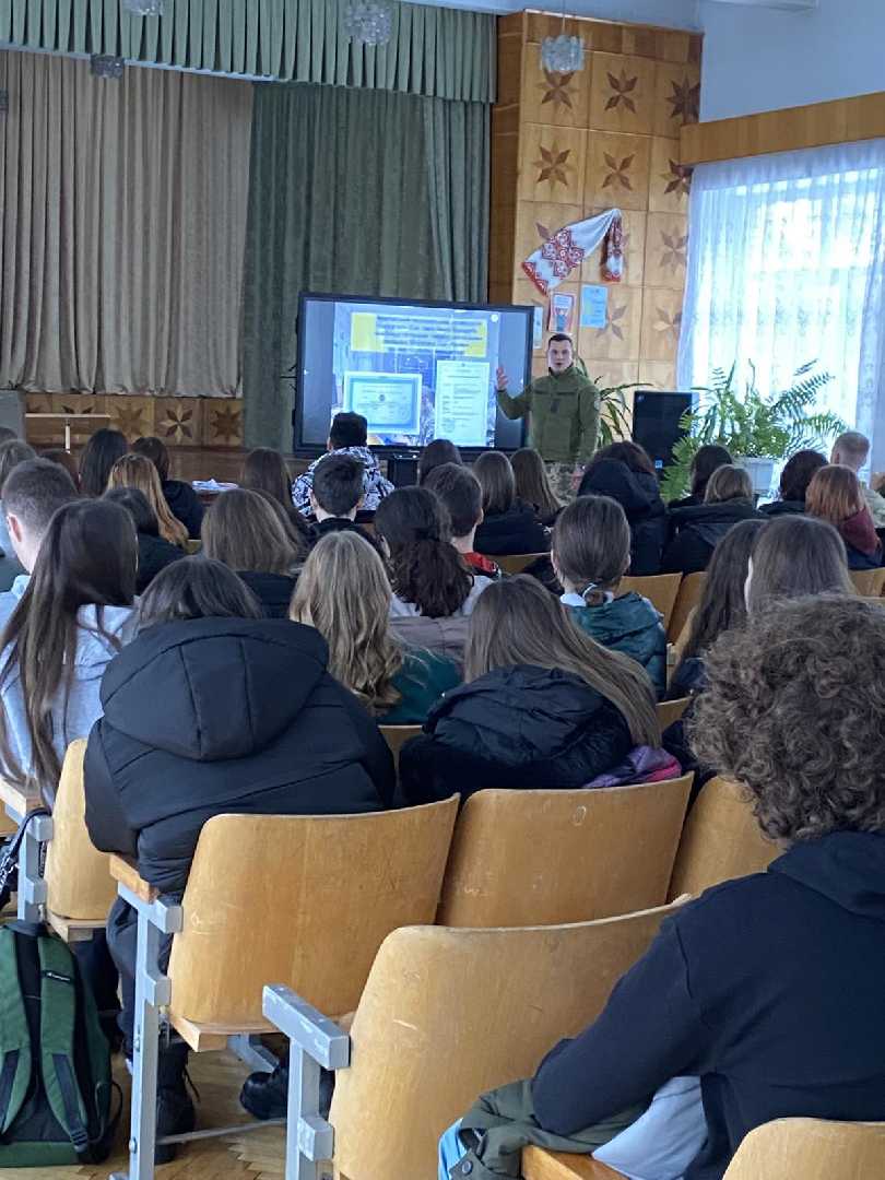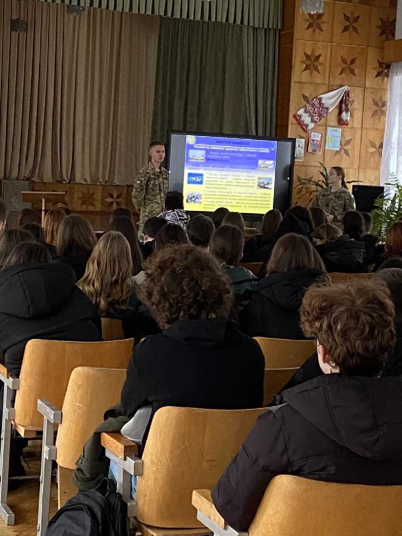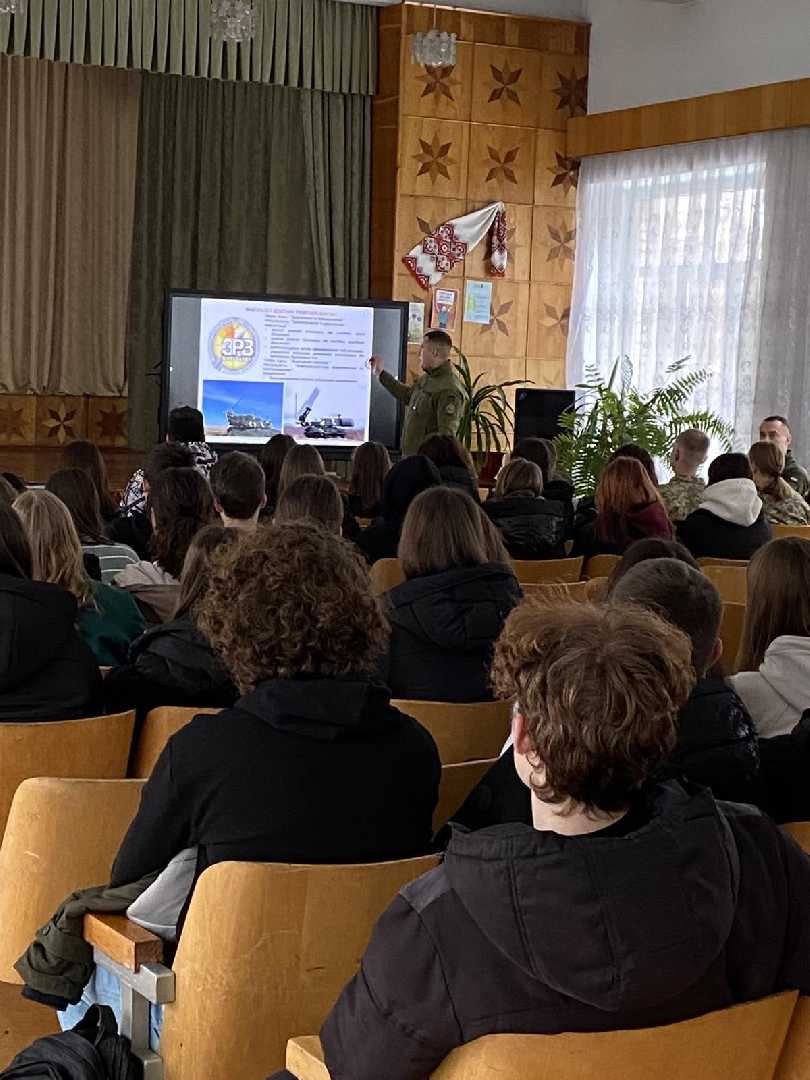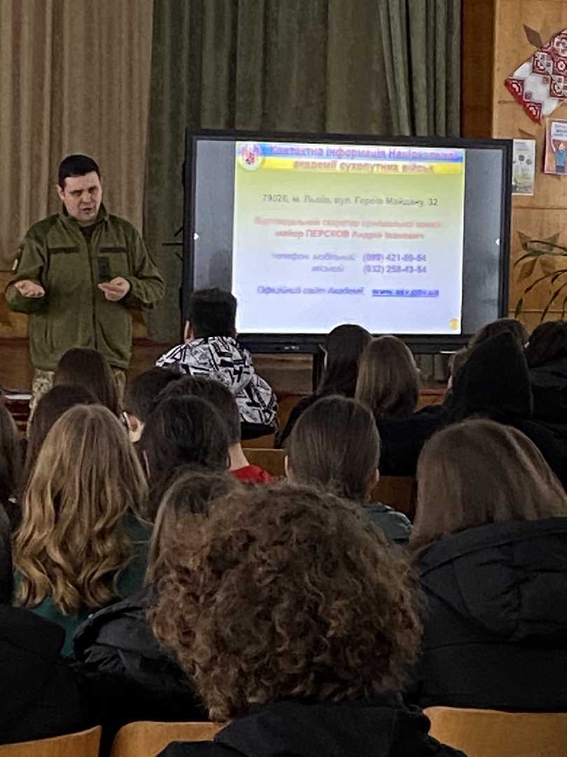 Підполковник Мосійчук С.О. ознайомив учнів із умовами вступу для здобуття командного, інженерного та гуманітарного фаху для механізованих, танкових, інженерних, ракетних військ і артилерії в Національній академії сухопутних військ і́мені гетьмана Петра Сагайдачного.