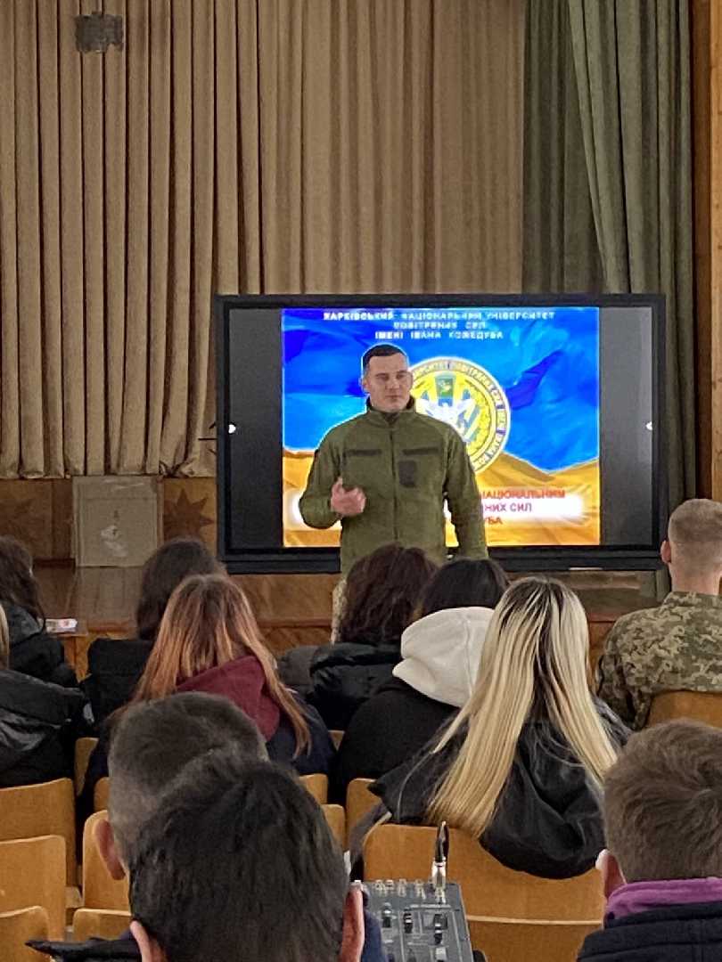 Про особливості підготовки військових льотчиків, штурманів, фахівців з бойового управління авіацією, зенітних ракетних військ учні дізналися від курсантів Харківського національного університету Повітряних Сил імені Івана Кожедуба та майора Іванченка О.І.