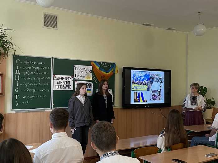 З нагоди Дня Гідності та Свободи, який відзначаємо 21 листопада, у 10-Д1 класі відбулася година спілкування на тему: «Ми не зганьбили славу наших предків, нових Героїв дали небесам». Ліцеїсти занурилися в ще зовсім недавні, але історично важливі події, під час яких наш народ склав іспит на політичну зрілість. Учні розмірковували над важливістю понять «гідність» та «свобода», які було відстояно на Майдані надто високою ціною. Присутні вшанували Героїв Небесної Сотні, які вибороли для нас право жити у вільній країні гідних людей! Слава Україні! Героям Слава!