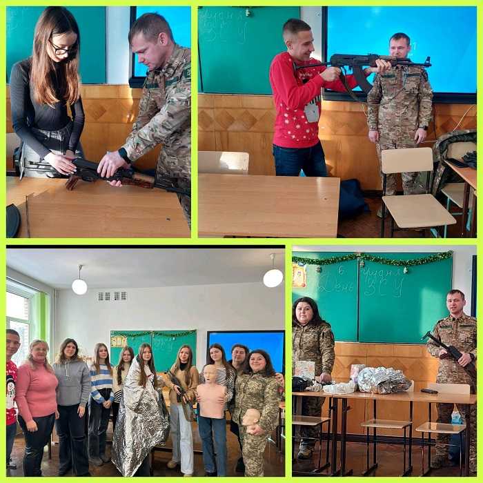 6 грудня 2023 року в День Збройних Сил України у Червоноградському ліцеї відбулась цікава зустріч учнів 5(9)-В класу (кл.керівник Богуш О.О.) і 10-В1 класу (кл.керівник Захарко Н.Ю.) з добровольцем ДФТГ ”Кристинопіль” Тетяною Гнатів і командиром та директором ДФТГ “Кристинопіль” Михайлом Палюгою. Було проведено заняття,на якому учням розповіли, як поводитись зі зброєю та тренінг з тактичної медицини. У святковий день,усі наші найщиріші вітання линуть до дорогих захисників.Велика шана,подяка і низький їм уклін!